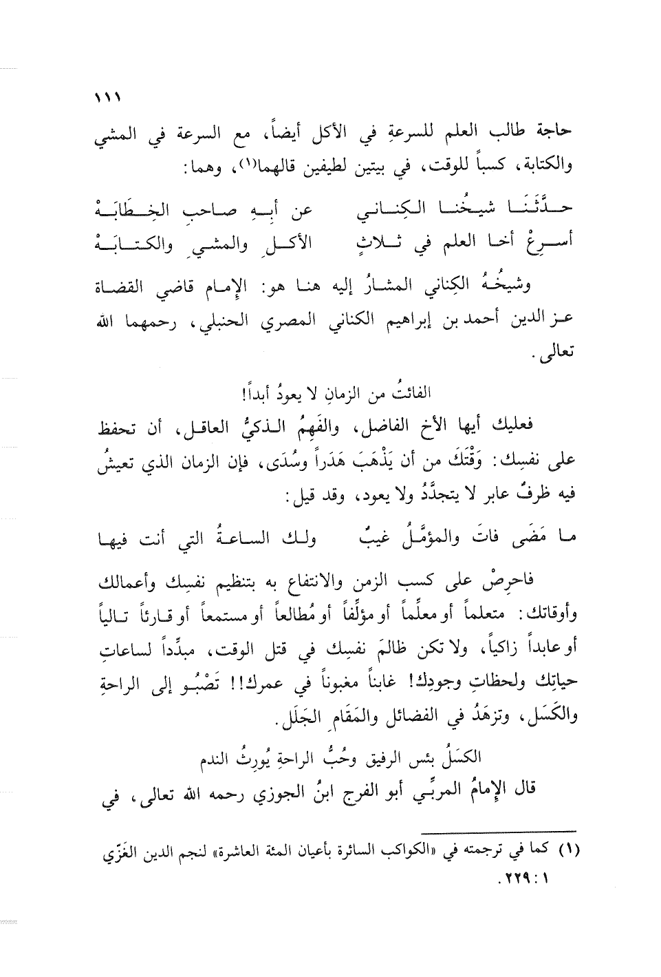 فاحرص على كسب الزمان والانتفاع به بتنظيم نفسك وأعمالك وأوقاتك: متعلما أو معلما أو مؤلفا أو مطالعا أو مستمعا أو قارئا تاليا أو عابدا زاكيا، ولا تكن ظالم نفسك في قتل الوقت، مبددا لساعات حياتك ولحظات وجودك! غابنا مغبونا في عمرك!! تصبوا إلى الراحة والكسل، وتزهد في الفضائل والمقام الجلل.
