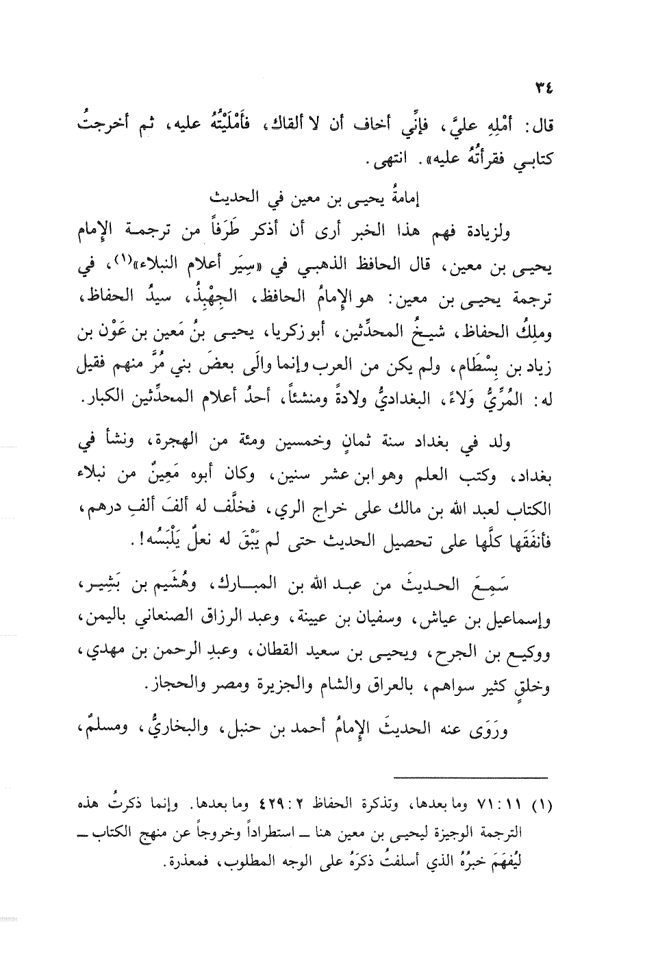 (¬1) 71:11 وما بعدها، وتذكرة الحفاظ 429:2 وما بعدها. وإنما ذكرت هذه الترجمة الوجيزة ليحيى بن معين هنا ـ استطرادا وخروجا عن منهج الكتاب ـ ليفهم خبره الذي أسلفت ذكره على الوجه المطلوب، فمعذرة.
