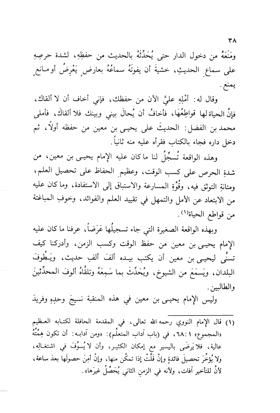 وبهذه الواقعة الصغيرة التي جاء تسجيلها عرضا، عرفنا ما كان عليه الإمام يحيى بن معين من حفظ الوقت وكسب الزمن، وأدركنا كيف تسنى ليحيى بن معين أن يكتب بيده ألف ألف حديث، ويطوف البلدان، ويسمع من الشيوخ، ويحدث بما سمعه وتلقاه ألوف المحدثين والطالبين.