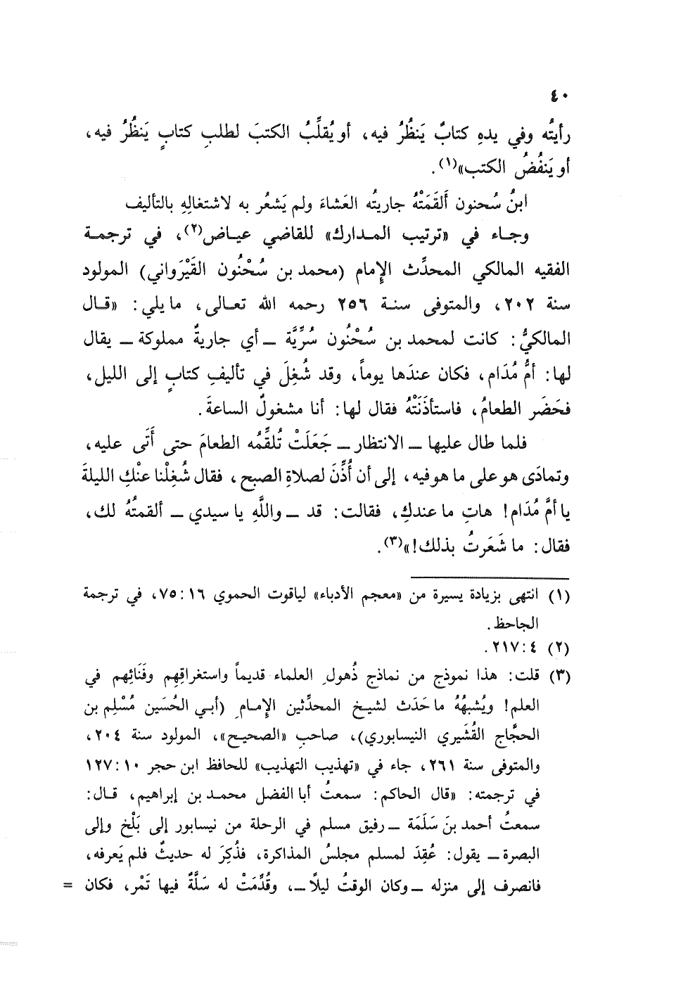 وجاء في ((ترتيب المدارك)) للقاضي عياض (¬2)، في ترجمة الفقيه المالكي المحدث الإمام (محمد بن سحنون القيرواني) المولود سنة 202، والمتوفي سنة 256 رحمه الله تعالى، ما يلي: ((قال المالكي: كانت لمحمد بن سحنون سرية - أي جارية مملوكة - يقال لها: أم مدام، فكان عندها يوما، وقد شغل في تأليف كتاب إلى الليل، فحضر الطعام، فاستأذنته فقال لها: أنا مشغول الساعة.