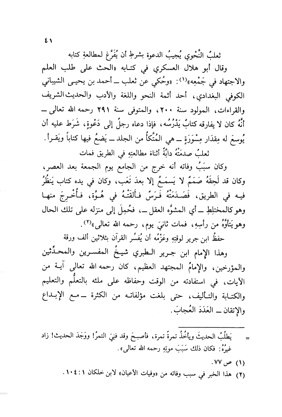 وقال أبو هلال العسكري في كتابه ((الحث على طلب العلم والاجتهاد في جمعه)) (¬1): ((وحكي عن ثعلب - أحمد بن يحيى الشيباني الكوفي البغدادي، أحد أئمة النحو واللغة والأدب والحديث الشريف والقراءات، المولود سنة 200، والمتوفي سنة 291 رحمه الله تعالى - أنه كان لا يفارقه كتاب يدرسه، فإذا دعاه رجل إلى دعوة، شرط عليه أن يوسع له مقدار مسورة - هي المتكأ من الجلد - يضع فيها كتابا ويقرأ.