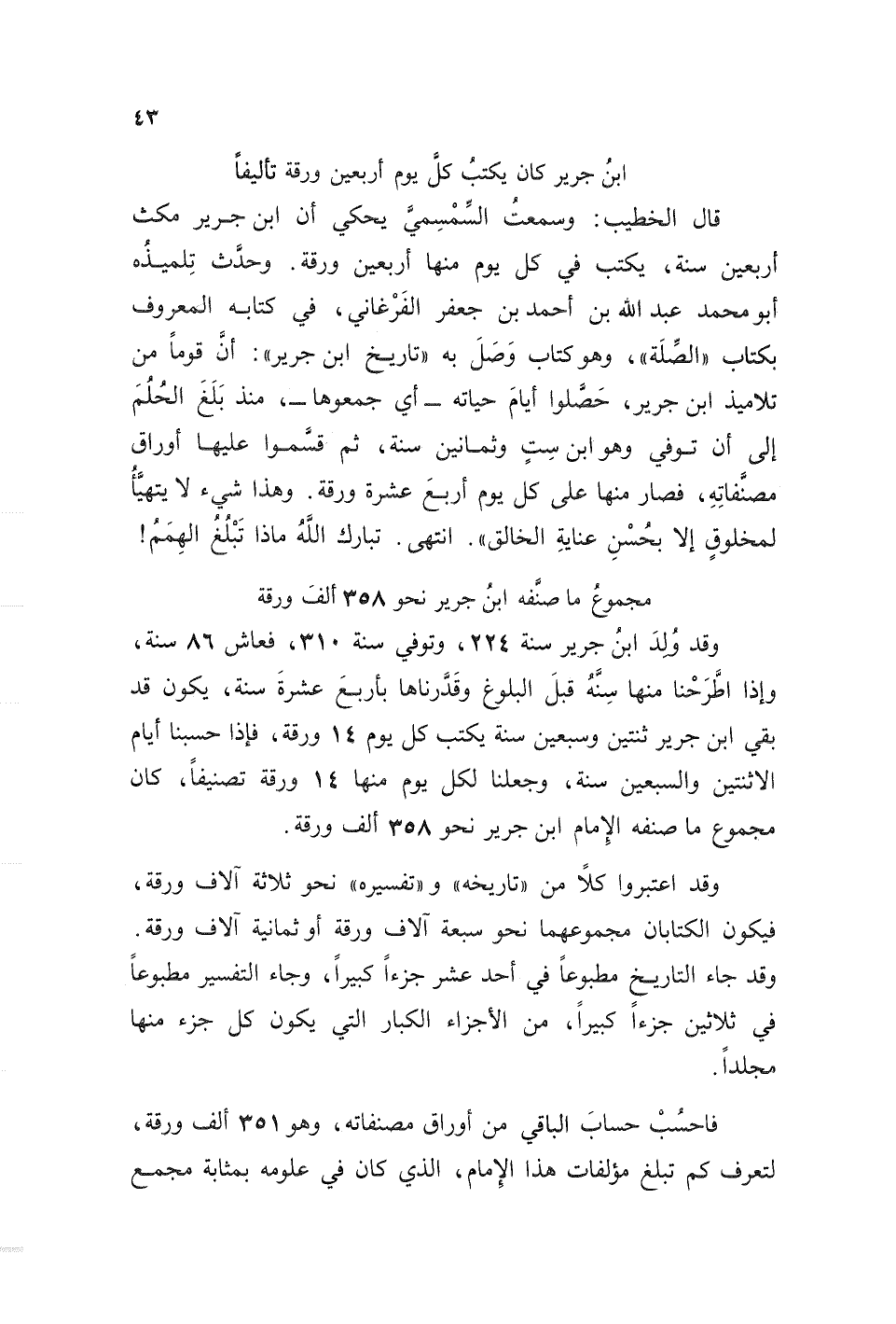 وقد ولد ابن جرير سنة 224، وتوفي سنة 310، فعاش 86 سنة، وإذا طرحنا منها سنه قبل البلوغ وقدرناها بأربع عشرة سنة، يكون قد بقي ابن جرير ثنتين وسبعين سنة يكتب كل يوم 14 ورقة، فإذا حسبنا أيام الاثنين والسبعين سنة، وجعلنا لكل يوم منها 14 ورقة تصنيفا، كان مجموع ما صنفه الإمام ابن جرير نحو 358 ألف ورقة.