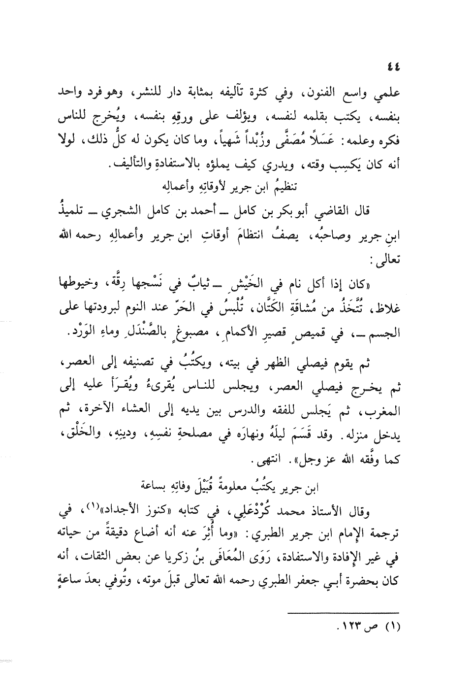 قال القاضي أبو بكر بن كامل - أحمد بن كامل الشجري - تلميذ ابن جرير وصاحبه، يصف انتظام أوقات ابن جرير وأعماله رحمه الله تعالى: