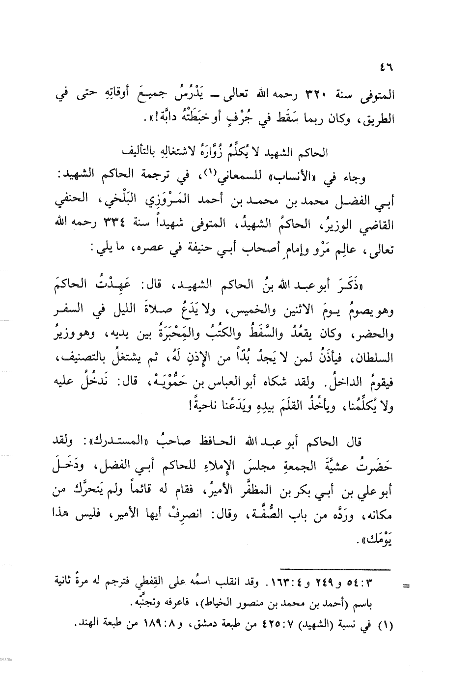 وجاء في ((الأنساب)) للسمعاني (¬1)، في ترجمة الحاكم الشهيد: أبي الفلض محمد بن محمد بن أحمد المروزي البلخي، الحنفي القاضي الوزير، الحاكم الشهيد، المتوفي شهيدا سنة 334 رحمه الله تعالى، عالم مرو وإمام أصحاب أبي حنيفة في عصره، ما يلي: