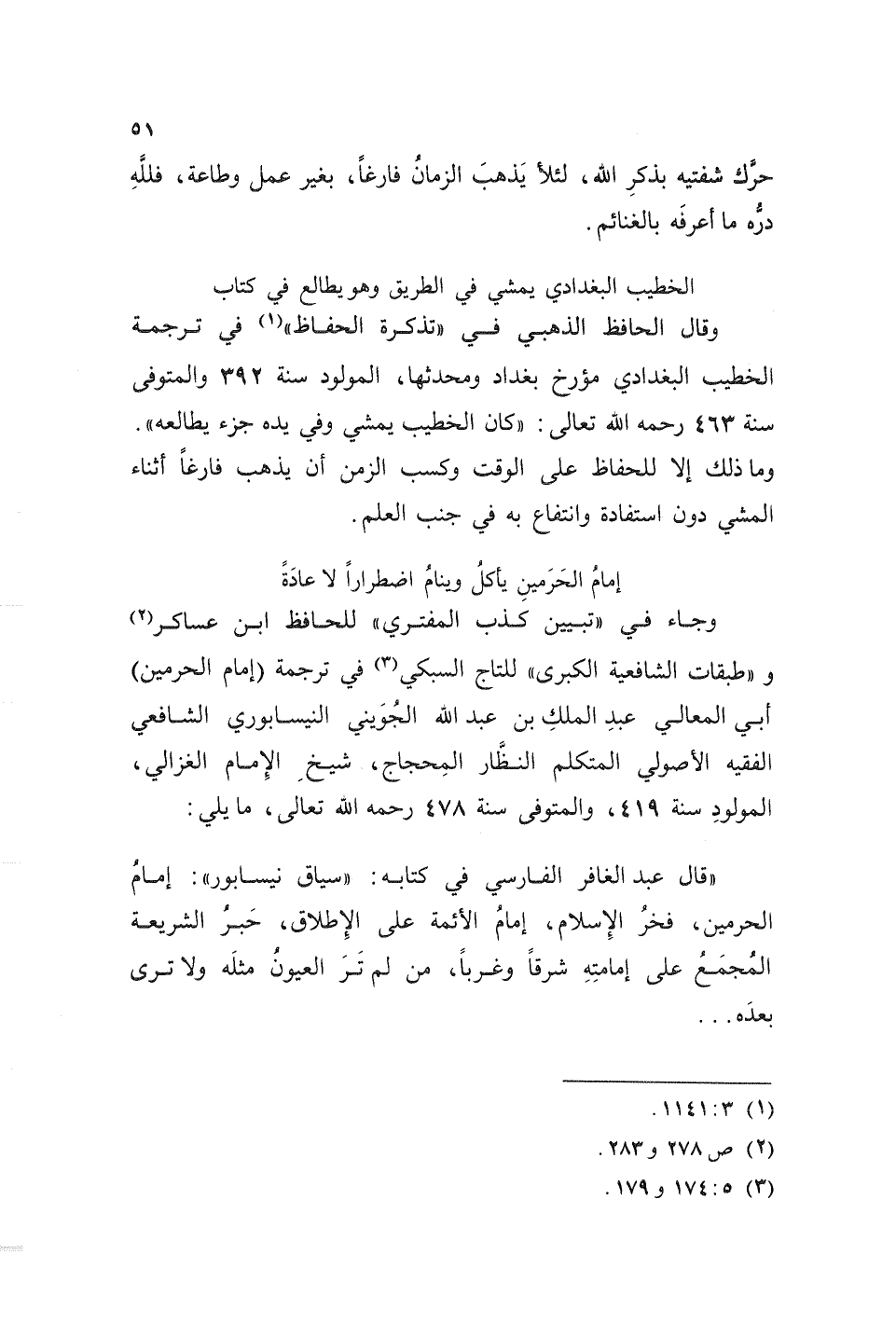 وقال الحافظ الذهبى في ((تذكرة الحفاظ)) (¬1) في ترجمة الخطيب البغدادي مؤرخ بغداد ومحدثها، المولود سنة 392 والمتوفي سنة 463 رحمه الله تعالى: ((كان الخطيب يمشي وفي يده جزء يطالعه)). وما ذلك إلا للحفاظ على الوقت وكسب الزمن أن يهب فارغا أثناء المشي دون استفادة وانتفاع به في جنب العلم.