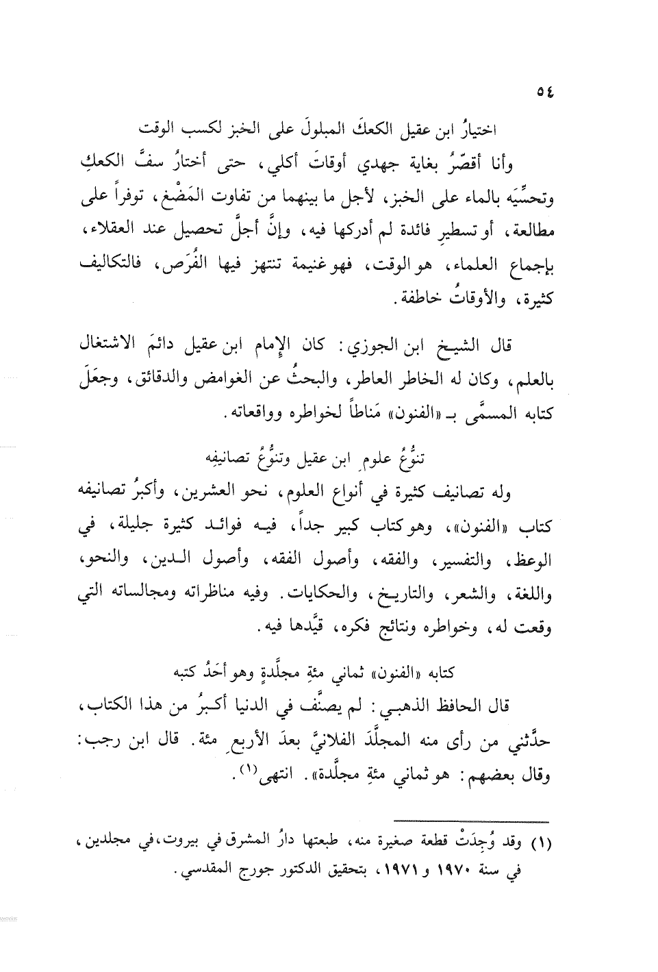 قال الشيخ ابن الجوزي: كان الإمام ابن عقيل دائم الاشتغال بالعلم، وكان له الخاطر العاطر، والبحث عن الغوامض والدقائق، وجعل كتابه المسمى ب ((الفنون)) مناطا لخواطره وواقعاته.