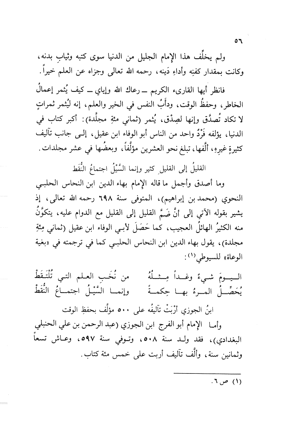 وما أصدق وأجما ما قاله الإمام بهاء الدين ابن النحاس الحلبي النحوي (محمد بن إبراهيم)، المتوفي سنة 698 رحمه الله تعالى، إذ يشير بقوله الآتي إلى أن ضم القليل إلى القليل مع الدوام عليه، يتكون منه الكثير الهائل العجيب، كما حصل لأبي الوفاء ابن عقيل (ثماني مئة مجلدة)، يقول بهاء الدين ابن النحاس الحلبي كما في ترجمته في ((بغية الوعاة)) للسيوطي (¬1):