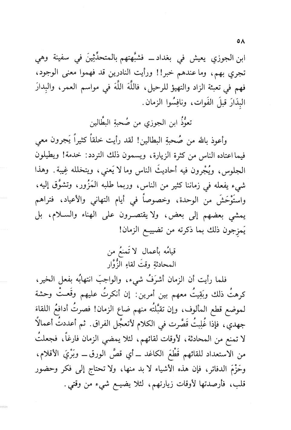 فلما رأيت أن الزمان أشرف شيء، والواجب انتهابه بفعل الخير، كرهت ذلك وبقيت معهم بين أمرين: إن أنكرت عليهم وقعت وحشة لموضع قطع المألوف، وإن تقبلته منهم ضاع الزمان! فصرت أدافع اللقاء جهدي، فإذا غلبت قصرت في الكلام لأتعجل الفراق. ثم أعددت أعمالا لا تمنع من المحادثة، لأوقات لقائهم، لئلا يمضي الزمان فارغا، فجعلت من الاستعداد للقائهم قطع الكاغد - أي قص الورق - وبري الأقلام، وحزم الدفاتر، فإن هذه الأشياء لابد منه، ولا تحتاج إلى فكر وحضور قلب، فأرصدتها لأوقات زيارتهم، لئلا يضيع شيء من وقتي.