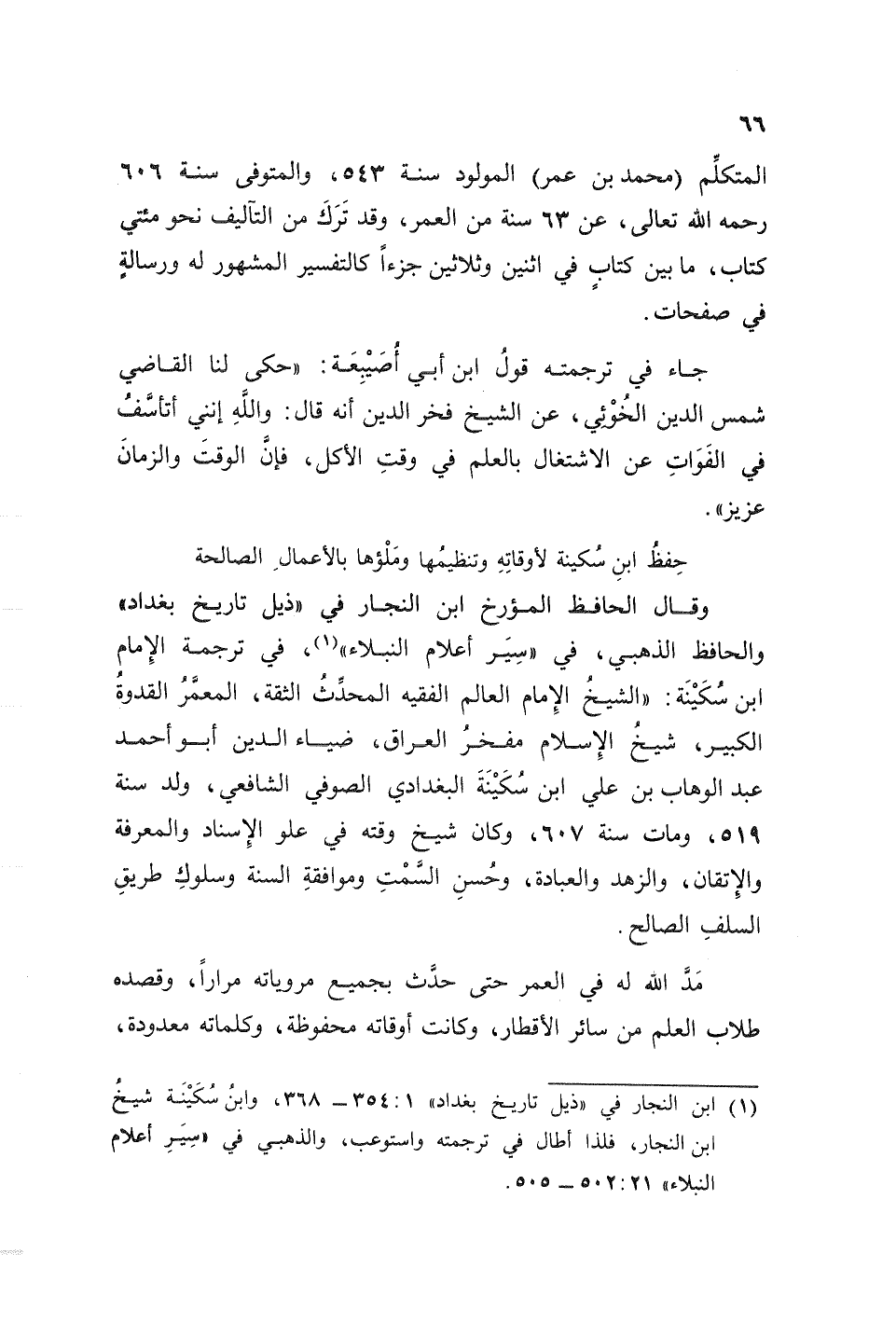 وقال الحافظ المؤرخ ابن النجار في ((ذيل تاريخ بغداد)) والحافظ الذهبي، في ((سير أعلام النبلاء)) (¬1)، في ترجمة الإمام ابن سكينة: ((الشيخ الإمام العالم الفقيه المحدث الثقة، المعمر القدوة الكبير، شيخ الإسلام مفخر العراق، ضياء الدين أبو أحمد عبد الوهاب بن علي ابن سكينة البغدادي الصوفي الشافعي، ولد سنة 519، ومات سنة 607، وكان شيخ وقته في علو الإسناد والمعرفة والأتقان، والزهد والعبادة، وحسن السمت وموافقة السنة وسلوك طريق السلف الصالح.
