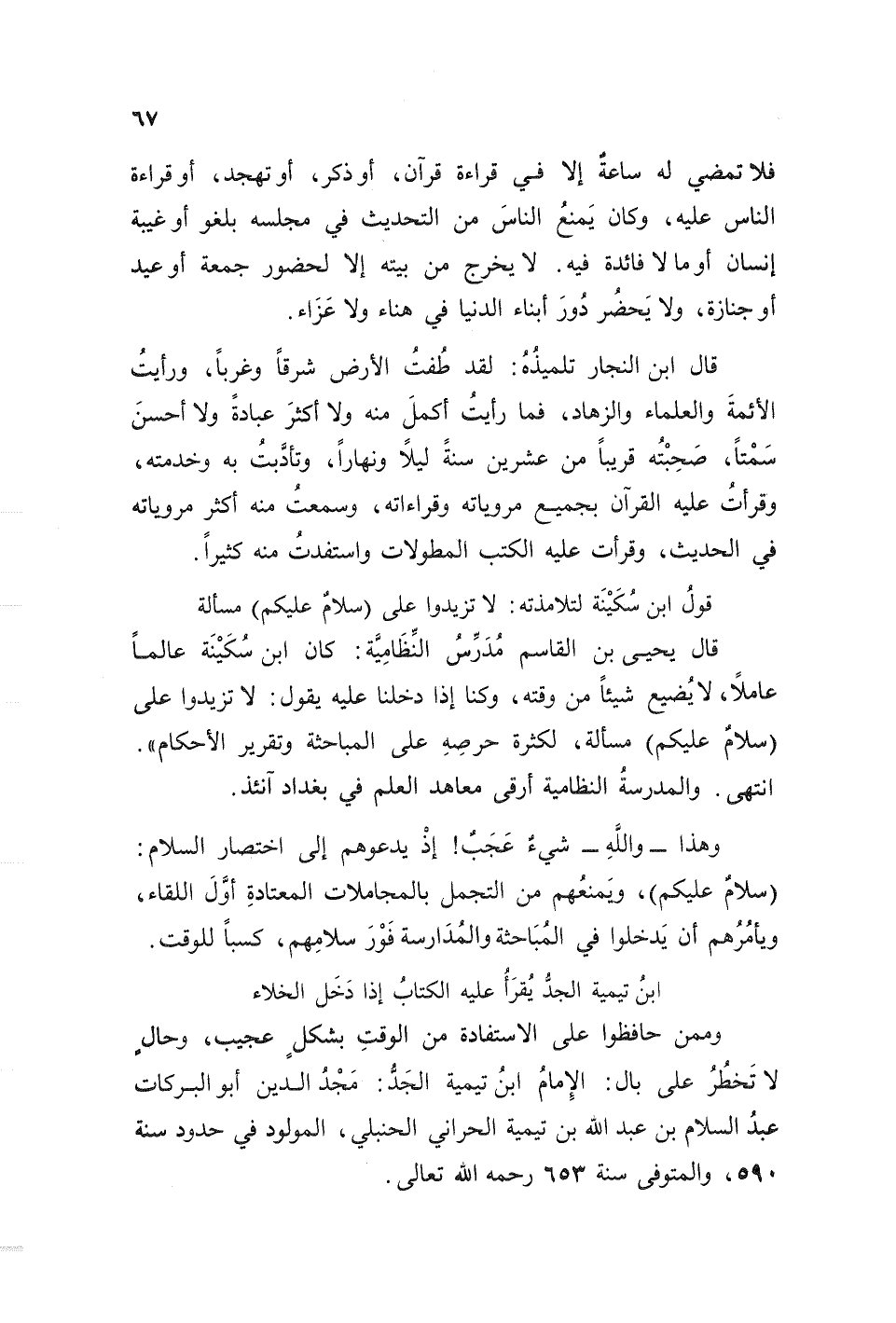 وممن حافظوا على الاستفادة من الوقت بشكل عجيب، وحال لا تخطر على بال: الإمام ابن تيمية الجد: مجد الدين أبو البركات عبد السلام بن عبد الله بن تيمية الحراني الحنبلي، المولود في حدود سنة 590، والمتوفي سنة 653 رحمه الله تعالى.