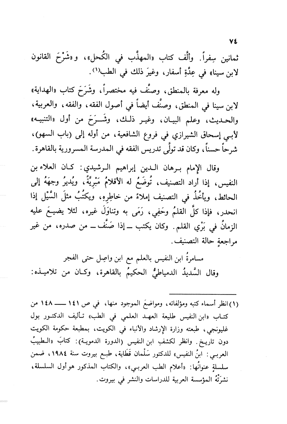 (¬1) انظر أسماء كتبه ومؤلفاته، ومواضع الموجود منها، في ص 141 - 148 من كتاب ((ابن النفيس طليعة العهد العلمي في الطب)) تأليف الدكتور بول غليونجي، طبعته وزارة الإرشاد والأنباء في الكويت، بمطبعة حكومة الكويت دون تاريخ. وانظر لكشف ابن النفيس (الدورة الدموية): كتاب ((الطبيب العربي: ابن النفيس)) للدكتور سلمان قطاية، طبع بيروت سنة 1984، ضمن سلسلة عنوانها: ((أعلام الطب العربي))، والكتاب المذكور هو أول السلسلة، نشرته المؤسسة العربية للدراسات والنشر في بيروت.