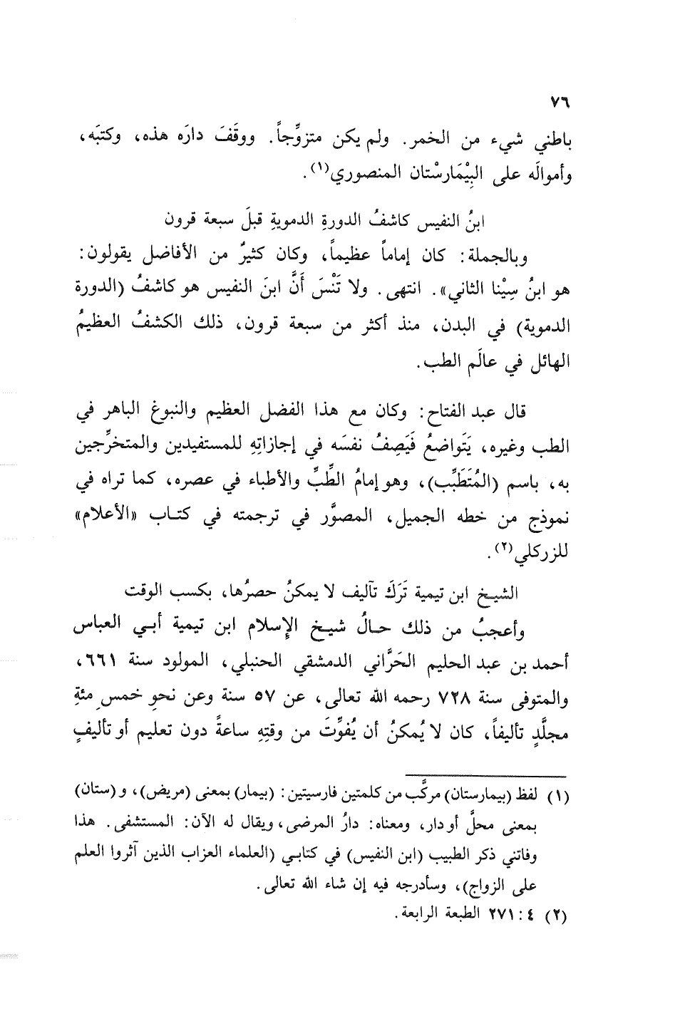 (¬1) لفظ (بيمارستان) مركب من كلمتين فارسيتين: (بيمار) بمعنى (مريض)، و (ستان) بمعنى محل أو دار، ومعناه: دار المرضى، ويقال له الآن: المستشفى. هذا وفاتنى ذكر الطبيب (ابن النفيس) في كتابي (العلماء العزاب الذين آثروا العلم على الزواج)، وسأدرجه فيه إن شاء الله تعالى.