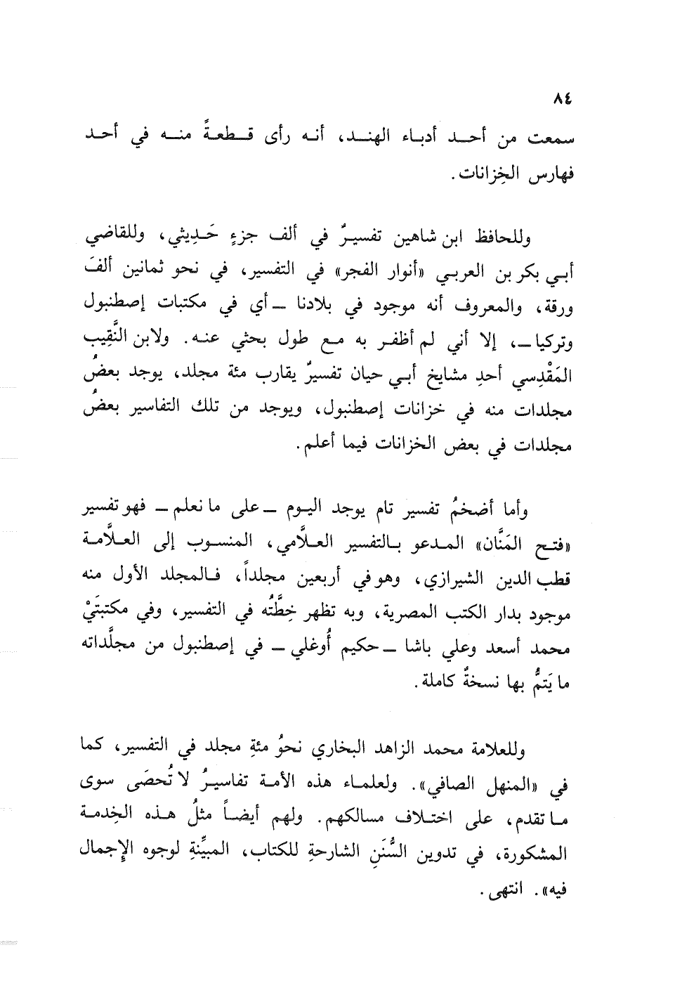 وللعلامة محمد الزاهد البخاري نحو مئة مجلد في التفسير، كما في ((المنهج الصافي)). ولعلماء هذه الأمة تفاسير لا تحصى سوى ما تقدم، على اختلاف مسالكهم. ولهم أيضا مثل هذه الخدمة المشكورة، في تدوين السنن الشارحة للكتاب، المبينة لوجوه الإجمال فيه)). انتهى.