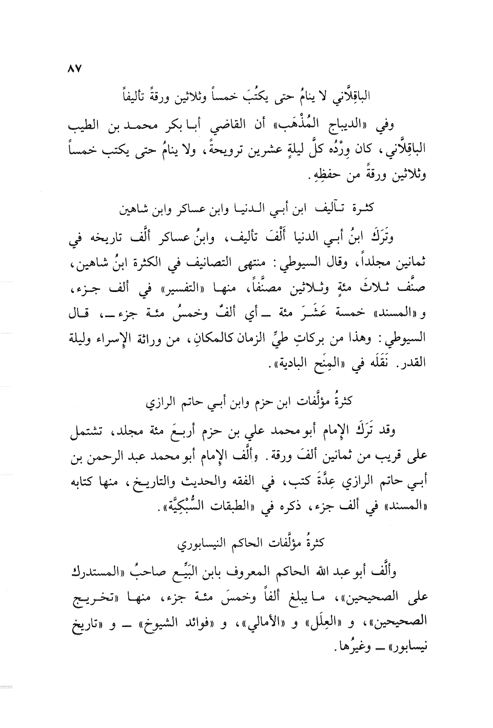وترك ابن أبي الدنيا ألف تأليف، وابن عساكر ألف تاريخه في ثمانين مجلدا، وقال السيوطي: منتهى التصانيف في الكثرة ابن شاهين، صنف ثلاث مئة وثلاثين مصنفا، منها ((التفسير)) في ألف جزء، و ((المسند)) خمسة عشر مئة - أي ألف وخمس مئة جزء -، قال السيوطي: وهذا من بركات طي الزمان كالمكان، من وراثة الإسراء وليلة القدر. نقله في ((المنح البادية)).