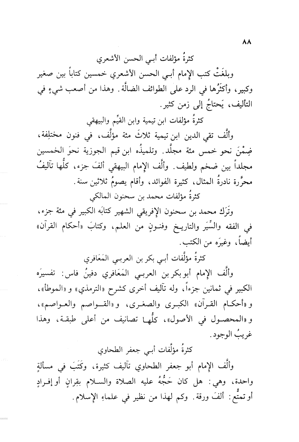 وترك محمد بن سحنون الإفريقي الشهير كتابه الكبير في مئة جزء، في الفقه والسير والتاريخ وفنون من العلم، وكتاب ((أحكام القرآن)) أيضا، وغيره من الكتب. كثرة مؤلفات أبي بكر بن العربي المعافري وألف الإمام أبو بكر بن العربي المعافري دفين فاس: تفسيره الكبير في ثمانين جزءا، وله تآليف أخرى كشرح ((الترمذي)) و ((الموطأ))، و ((أحكام القرآن)) الكبرى والصغرى، و ((القواصم والعواصم))، و ((المحصول في الأصول))، كلها تصانيف من أعلى طبقة، وغريب الوجود.