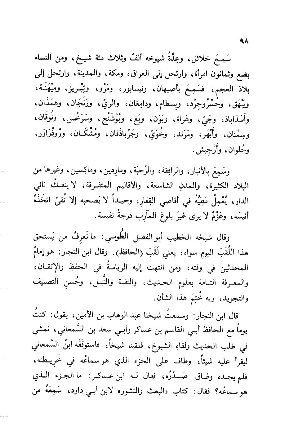 وسمع بالأنبار، والرافقة، والرحبة، وماردين، وماكسين، وغيرها من البلاد الكثيرة، والمدن الشاسعة، والأقاليم المتفرقة، لا ينفك نائي الدار، يعمل مطيه في أقاصي القفار، وحيدا لا يصحبه إلا تقى اتخذه أنيسه، وعزم لا يرى غير بلوغ المآرب درجة نفيسة.