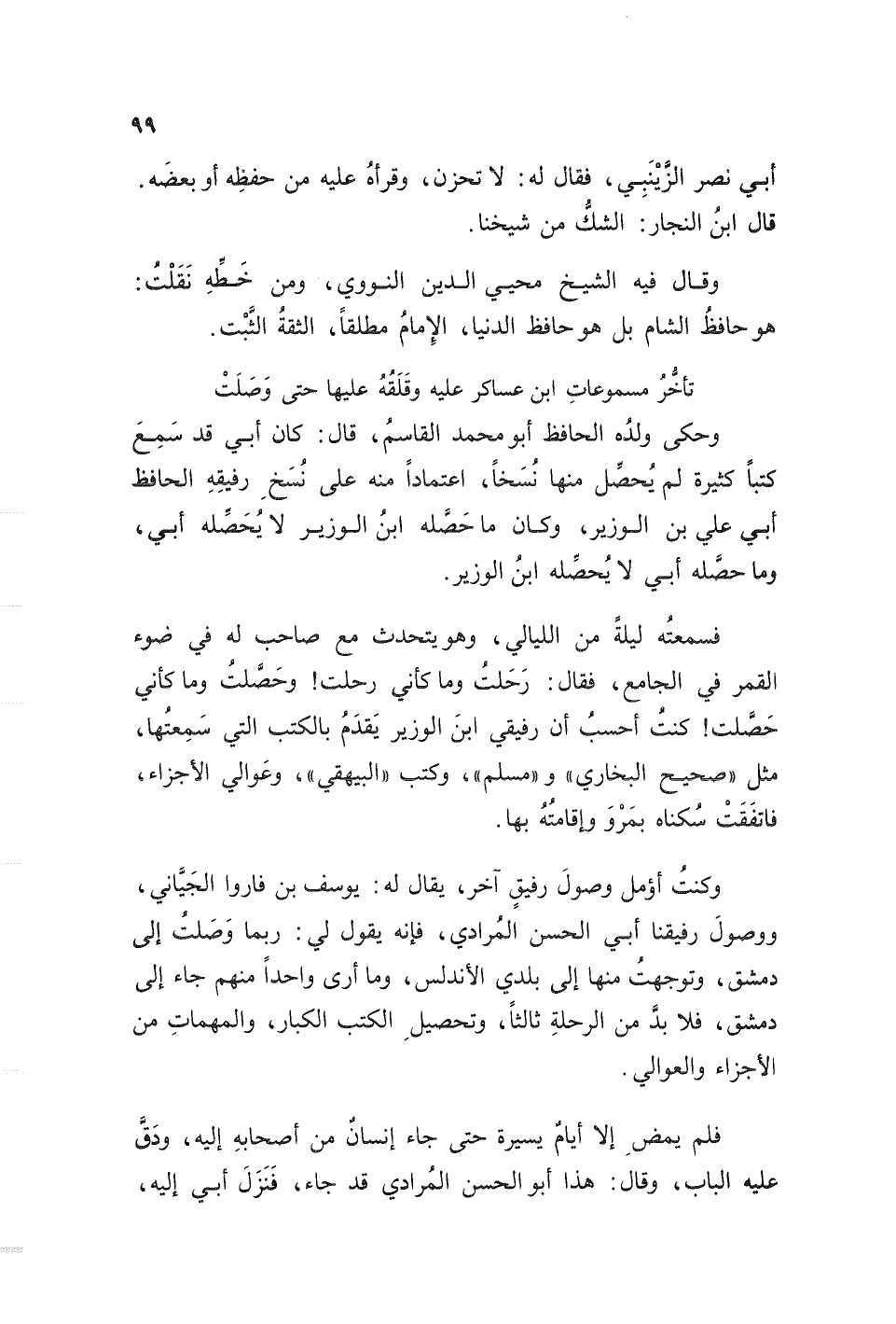 وكنت أؤمل وصول رفيق آخر، يقال له: يوسف بن فاروا الجياني، ووصول رفيقنا أبي الحسن المرادي، فإنه يقول لي: ربما وصلت إلى دمشق، وتوجهت منها إلى بلدي الأندلس، وما أرى واحدا منهم جاء إلى دمشق، فلابد من الرحلة ثالثا، وتحصيل الكتب الكبار، والمهمات من الأجزاء والعوالي.