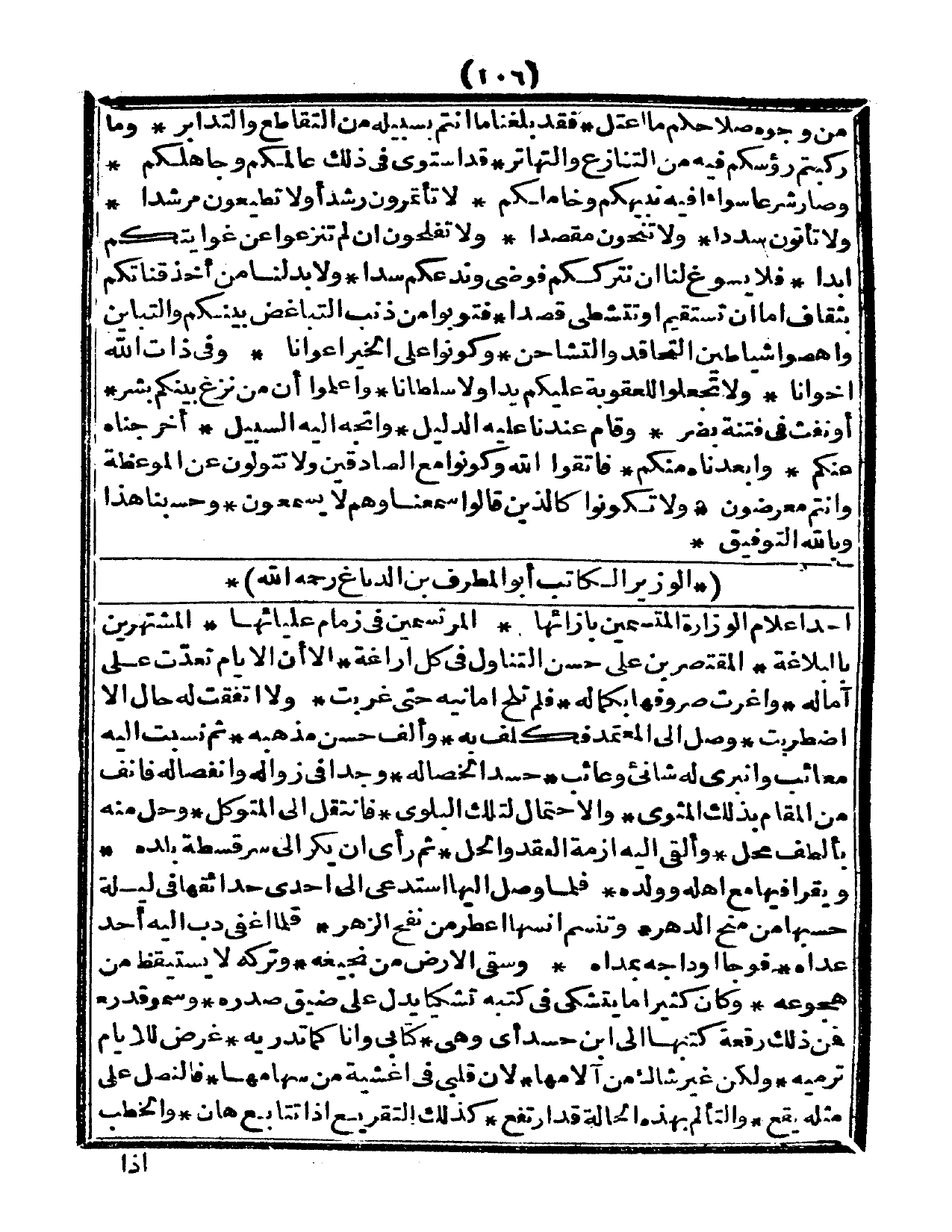 من وجوه صلاحكم ما اعتل، فقد بلغنا ما أنتم بسبيله من التقاطع والتدابر، وما ركبتم رؤوسكم فيه من التنازع والتهاتر، وقد استوى في ذلك عالمكم وجاهلكم، وصار شرعاً سواء فيه نبيهكم وخاملكم، ولا تأتمرون رشداً، ولا تطيعون مرشدا، ولا تأتون سددا، ولا تنحون مقصدا ولا تفلحون إن لم تنزعوا عن غوايتكم أبداً، فلا يسوغ لنا أن نترككم فوضى وندعكم سدى، ولابد لنا من أخذ قناتكم بثقاف أما أن تستقيم أو تتشظى قصداً، فتوبوا من ذنب التباغض بينكم والتباين، واهصوا شياطين التحاقد والتشاحن، وكونوا على الخير أعوانا، وفي ذات الله أخوانا، ولا تجعلوا لعقوبة عليكم يدا ولا سلطانا، واعلموا أن من نزغ بينكم بشر، أو نفث في فتنة بضر، وقلم عندنا عليه الدليل، واتجه إليه السبيل، وأخرجناه عنكم، وأبعدناه منكم، فاتقوا الله وكونوا مع الصادقين ولا تتولوا عن الموعظة وأنتم معرضون، ولا تكونوا كالذين قالوا سمعنا وهم لا يسمعون، وحسبن هذا وبالله التوفيق.