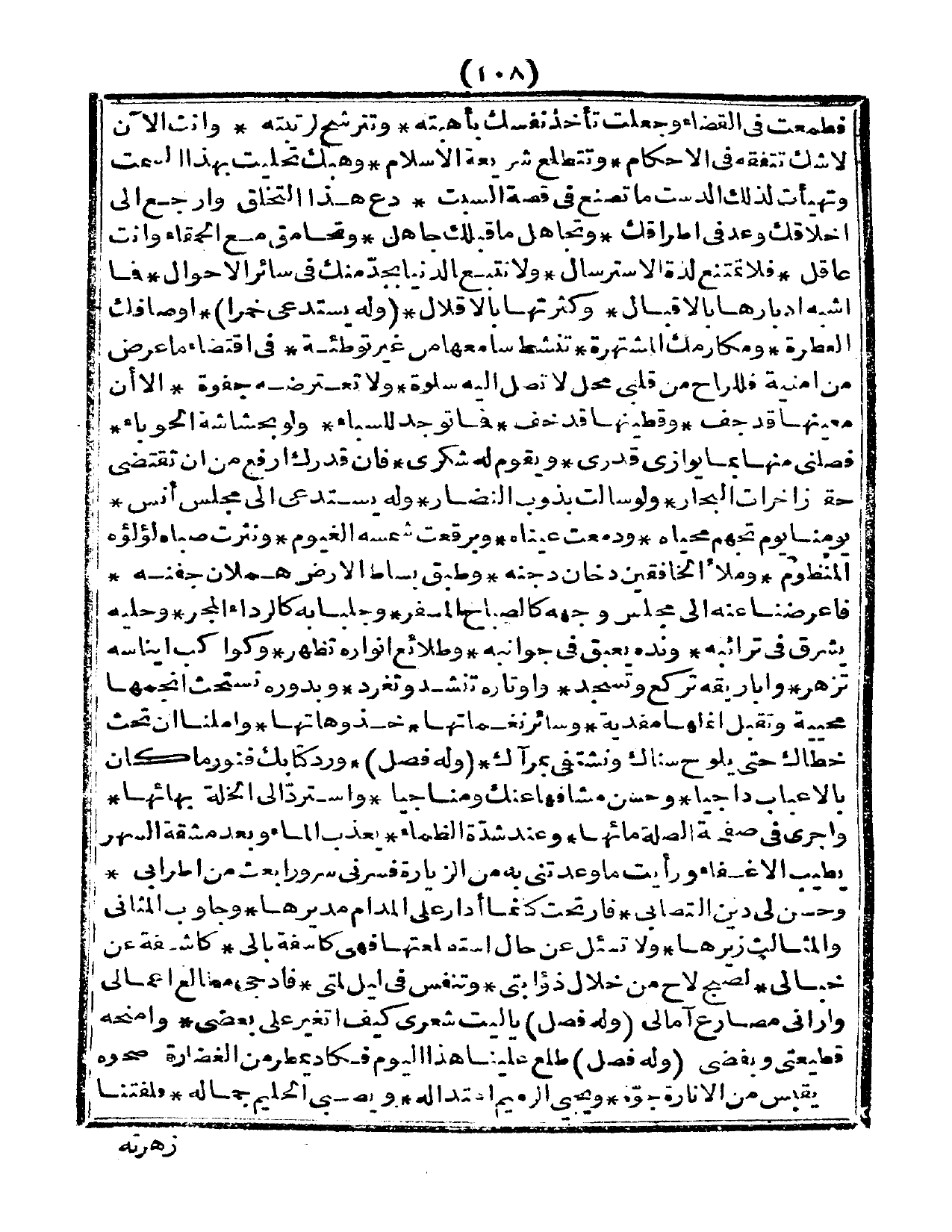 فطمعت في القضاء وجعلت تأخذ شريعة نفسك باهته، وتترشح لرتبته، وأنت الآن لاشك تتفقه في الأحكام، وتتطلع شريعة الإسلام، وهبك تحليت بهذا السمت، ونهيات لذلك الدست، وما تصنع في قصة السبت، ودع هذا التخل وارجع إلى أخلاقك، وعد في أطراقك، وتجاهل ما قبلك جاهل، وتحاق مع الحمقاء وأنت عاقل، فلا تمتنع لذة الاسترسال، ولا تتبع الدنيا بجد منك في سائر لأحوال، فما أشبه أدبارها بالإقبال، وكثرتها بالإقلال، وله يستدعي خمراً، أوصافك العطرة، ومكارمك المشتهرة، تنشط سامعها من غير توطئة، في اقتضاء ما عرض من أمنية، فللراح من قلبي محل لا تصل إليه سلوة، ولا تعترضه جفوة، إلا أن معانيها قد جف، وقطينها قد خف، فما توجد للسباء، لو بحشاشة الحرباء، فصلني منها مما يوازي قدري، ويقوم له شكري، فإن قدرك أرفع من أن تقتضي حقه زاخرات البحار، ولو سالت بذوب النضار، وله يستدعي إلى مجلس أنس، يومنا يوم تجهم محياه، ودمعت عيناه، وبرقعت شمسه الغيوم، ونثرت صباه لؤلؤة المنظوم، وملأ الخافقين دخان دجنه، وطبق بساط الأرض هملان جفنه، فأعرضنا عنه إلى مجلس وجهه كالصباح المسفر، وجلبابه كالرداء المجر، وحله يشرق في ترائبه، ونده يعبق في جوانبه، وطلائع أنواره تظهر، وكواكب إيناسه تزهر، وأباريقه تركع وتسجد، وأوتاره تنشد وتغرد، وبدوره تستحث خطاك، وتقبل أنملها مفدية، وسائر نغماتها، خذ وهاتها، وأملنا أن تحث خطاك، حتى يلو سناك، ونشتفي بمرءاك، وله فصل، ورد كتابك فنور ما كان بالإعباب داجيا، وحسن مشافها عنك ومناجيا، واسترد إلى الخلة بهاءها، وأجرى في صفحة الصلة ماءها، وعند شدة الظمأ، يعذب الماء وبعد مشقة السهر طيب لإغفاء، ورأيت ما وعدتني به من الزيار فسرني بعض من أطرابي، وحسن لي دين التصابي، فارتحت كأنما أدر علي المدام مديرها، وجاوب المثاني والمثالث زيرها، ولا تسأل عن حال استطلعتها فيه كاسفة بالي، كاشفة عن خبالي، ولصبح لاح من خلال ذوابتي، وتنفس في ليل لمتي، فأدجى مطالع أعمالي، وأراني مصارع أمالي، وله فصل، يا ليت شعري كي أتغير على بعضي، وأمنحه قطيعتي وبغضي، وله فصل، طلع علينا هذا اليوم فكاد يمطر من الغضارة صحوة، ويقبس من الإنارة جوه، ويحيي الرميم اعتداله، ويصبي الحليم جماله، فلف٥تنا