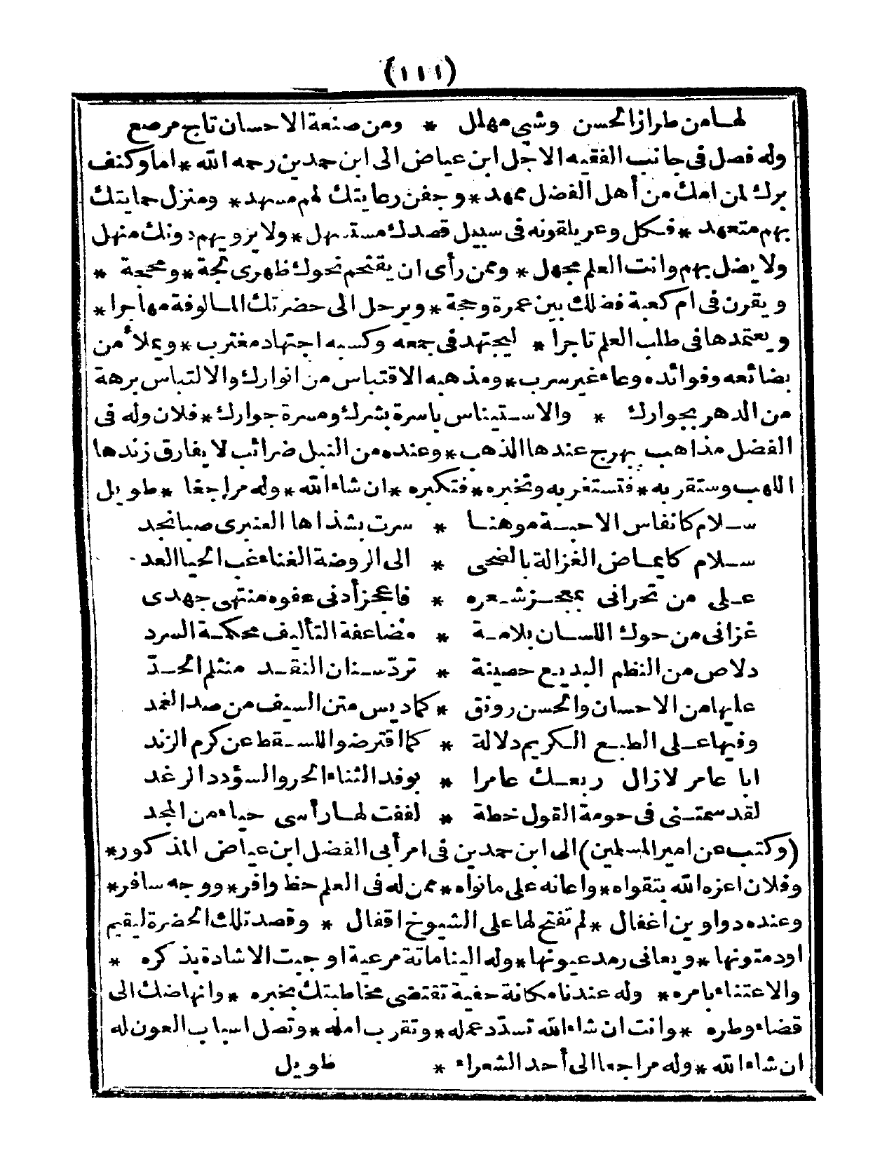 وكتب عن أمير المسلمين إلى ابن حمدين في أمر أب الفضل ابن عياض المذكور، وفلان أعزه الله بتقواه، وأعانه على ما نواه، ممن له في العلم حظ وافر، وزوجه سافر، وعنده دواوين إغفال، ولم تفتح لها على الشيوخ إقفال، وقصد تلك الحضرة ليقيم أود متونها، ويعاني رمد عيونها، وله إلينا ماتة مرعية أوجبت الإشادة بذكره، والاعتناء بأمره، وله عندنا مكانة حفية تقضي مخاطبتك بخبره، وإنهاضك إلى قضاء وطره، وأنت إن شاء الله تسدد عمله، وتقرب أمله، وتصل أسباب العون له، إن شاء الله، وله مراجعا إلى أحد الشعراء. طويل