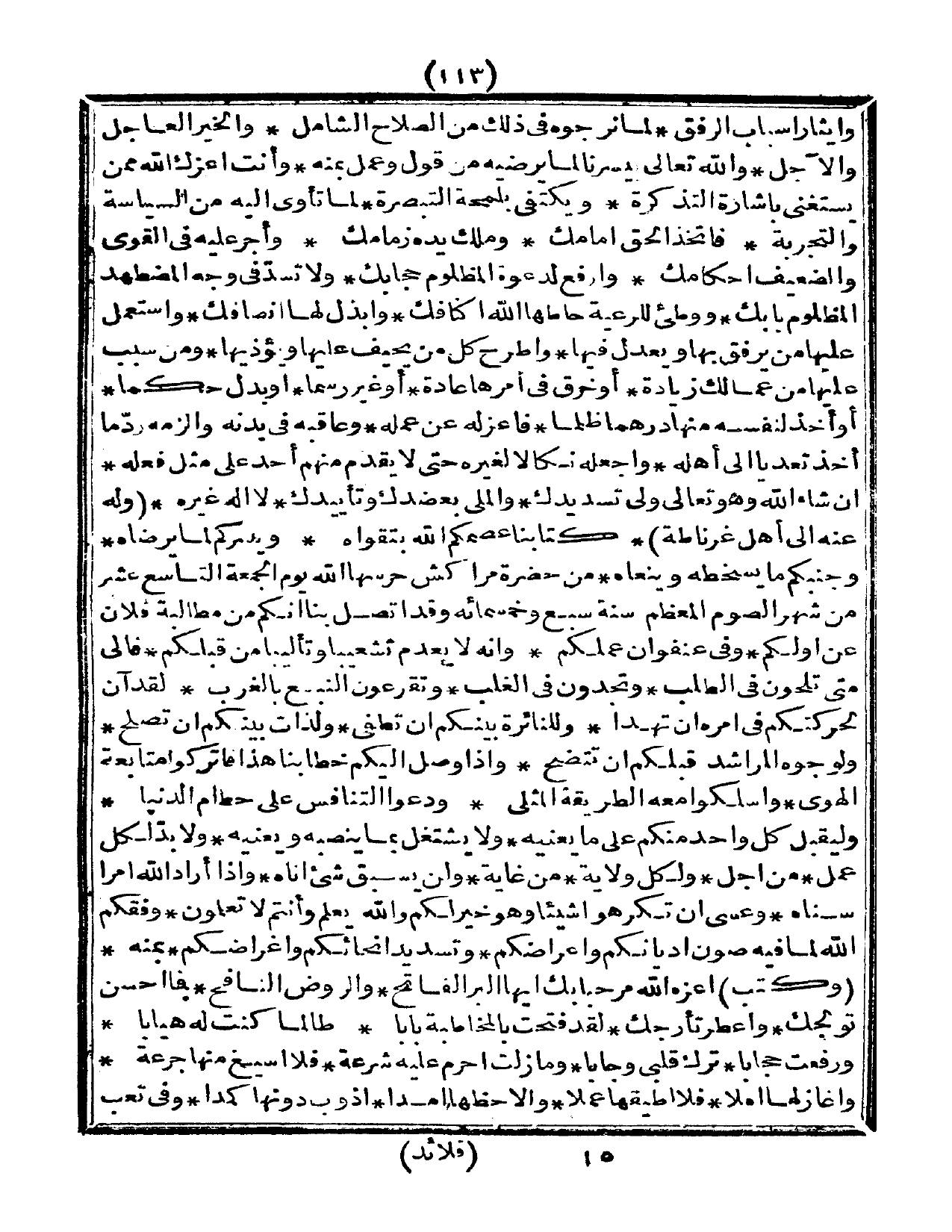 وإيثار أسباب الرفق لما نرجوه في ذلك من الصلاح الشامل، والخير العاجل والأجل، والله تعالى ييسرنا لما يرضيه من قول وعمل بمنه، وأنت أعزك اله ممن يستغنى بإشارة التذكرة، ويكتفي بلمحة التبصرة، ولما تأوى إليه من السياسة والتجربة، اتخذ الحق أمامك، وملك يده زمانك، وأجر عليه في القوي والضعيف أحكامك، وارفع لدعوة حجابك، ولا تسد في وجه المضطهد المظلوم بابك، ووطئ للرعية حاطها الله أكنافك، وأبذل لها أنصافك واستعمل عليها من يرفق بها ويعدل فيها، واطرح كل من يحيف عليها ويوذيها، ومن سبب عليها من عمالك زيادة، أو خرق لا في أمرها عادة، أو غير رسما، أو بدل حكما، أو أخذ لنفسه منها درهما ظلما، فاعزله من علمه، وعاقبه في نده، والزمه رد ما أخذ تعديا إلى أهله، واجعله نكالاً لغيره فاعزله عن عمله، وعاقبه في ندنه، والزمه رد ما أخذ تعديا إلى أهله، واجعله نكالاً لغيره حتى لا قدم منهم أحد على مثل عله، إن شاء الله وهو تعالى ولي تسديدك، والملي بعضدك وتأييدك لا إله غيره، وله عنه إلى أهل غرناطة، كتابنا عصمكم الله بتقواه، ويسركم لما يرضاه وجنبكم ما يسخطه وينعاه، ومن حضرة مراكش حرسها لله يوم الجمعة التاسع عشر من شهر الصوم المعظم سنة سبع وخمساية وقد اتصل بنا أنكم من مطالبة فلان على أولكم، وفي عنفوان عملكم، وأنه لا يعدم تشغيباً وتأليباً من قبلكم، فإلى متى تلحون في الطلب، وتجدون في الغلب، وتقرعون النبع بالغرب، لقد آن حركتكم في أمره أن تهدي، وللنائرة بينكم أن تطفي، ولذات بينكم أن تصلح، ولوجوه المراشد قبلكم أن تضح، وإذا وصل إليكم خطابنا هذا فاتركوه متابعة الهوى، واسلكوا معه الطريقة المثلى، ودعوا التنافس على حطام الدنيا، وليقبل كل واحد منكم على ما يعنيه، ولا يشتغل بما ينصبه ويعنيه، لابد لكل عمل، من أجل ولكل ولاية، ومن غاية، ولن يسبق شيء أناه، وإذا أراد الله أمرا سناه، وعسى أن تكرهوا شيئاً وهو خير لكم والله يعلم وأنتم لا تعلمون، وفقكم الله لما فيه صون أديانكم وأعراضكم، وتسديد أنحائكم وأغراضكم بمنه، وكتب أعزه الله مرحبا بك أيها البر الفاتح، والروض النافح، فما أحسن تويجك، وأعطر تارجك، لقد تحت بالمخاطبة بابا، طالما كنت له هيابا، ورعت حجابا، وترك قلبي وجابا، وما زلت أحوم عليه شرعة، وفلا أسيغ منها جرعة، وأغازلها أملاً، فلا أطيقها عملاً، وألاحظها أمدا، أذوب دونها كمدا، وفي تعب