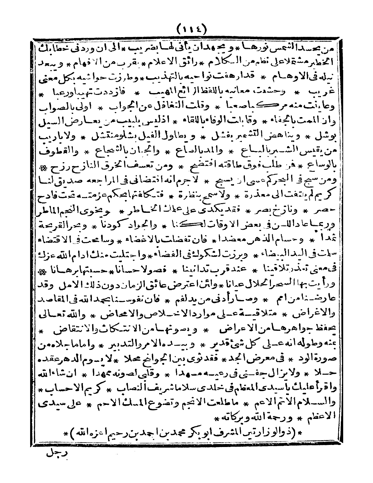 ولا باريب من قيس الشبر بالبارع، والمد بالصاع، والجبان بالشجاع، والقطوف بالوساع، فمن طلب فوق طاقته افتضح، ومن تعسف الخرق النازح رزح، ومن سبح ف البحر كم عسى أن يسبح، ولا جرم أنه اقتضاني في المراجعة صديق لنا كريم لم لتت إلى معذرة، ولا سمح بنظرة، فتكلفتها بحكم عزمته وتحت فادح حصر، ونازح بصر، فقد يكدي على علمك الخاطر، ويحوي النجم الماطر، وربما عاد اللسن في بعض الأوقات لكنا، والجواد كودنا، وبحر القريحة ثمدا، وحسام الذهن معضدا، فإن تفضلت بالأعضاء، سامحت في الاقتضاء، وسلمت لك في اليد البيضاء، وبرزت لشكرك في الفضاء، واجتليت منك أدام الله عزك ف معنى تعذر تلاقينا، عند قرب تدانينا، فصولاً حساناً حسبتها برهانا، ورأيت بها السحر الحلال عيانا، ولئن اعترض عائق الزمان دون ذلك الأمل وقد عارضنا من أمم، وصار أدنى من يد لفم، فإن نفوسنا بحمد الله في المقاصد والأغراض، متلاقية على موارد الإخلاص ولا محاض، والله تعالى بحفظ جواهرها من الأرض، ويصونها من الانتكاث والانتفاض، بمنه وطوله أنه على كل شيء قدير، وبيده الأمر والتدبير، وأما ما جلاه من صورة الود، في معرض الجد، وفقد ثوى بين الجوانح محلاً، لا يسوم الدهر عقده حلا، ولا يزال جفني ف رعيه مسهدا، وقلبي لصونه ممهداً، إن شاء الله واقرأ عليك يا سيدي المعظم في خلدي ساماً شريف النصاب، كريم الإحساب، والسلام الأتم الدعم، ما طلعت الأنجم وتضوع المسك الأحم، على سيدي الأعظم، ورحمة الله وبركاته.