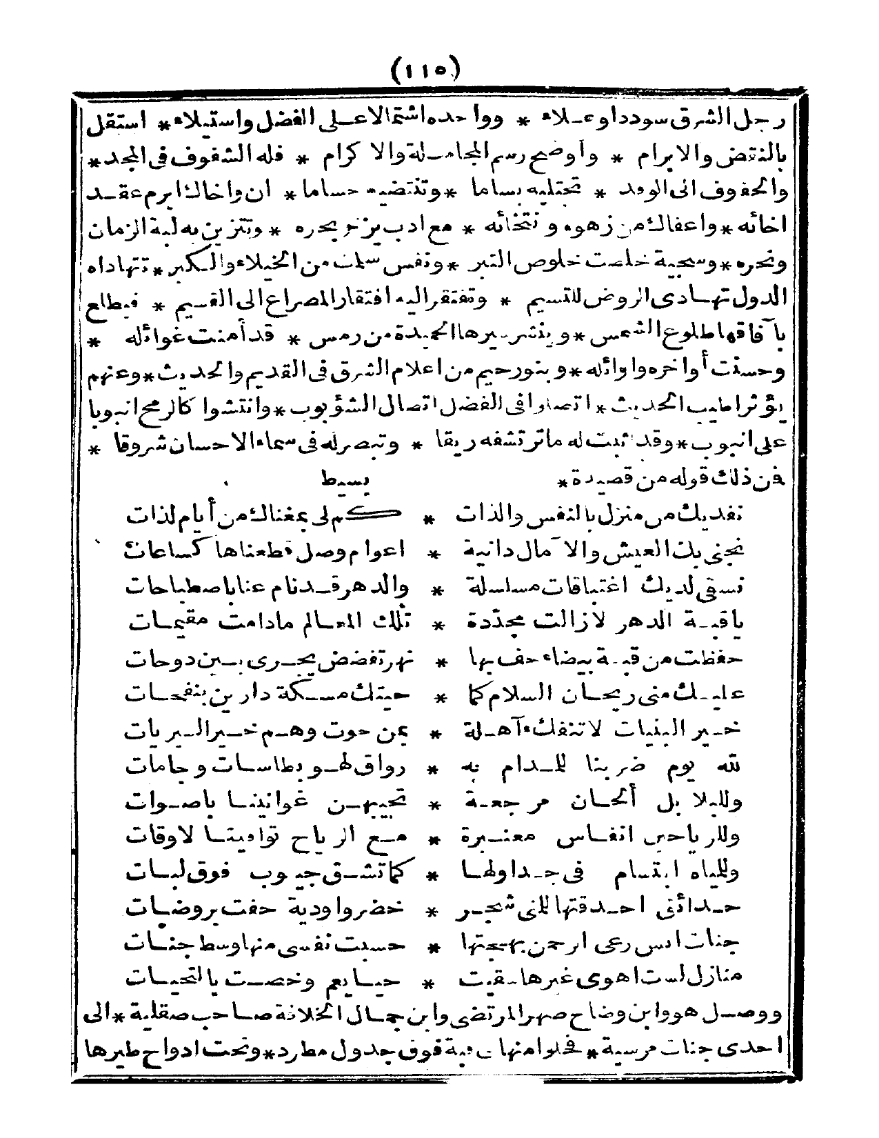 رجل الشرق سودداً وعلاء، وواحدة اشتمالاً على الفضل واستيلاء، استقل بالنفض والإبرام، وأوضح رسم المجاملة والإكرام، فله الشفوف في المجد، والحفوف إلى الوفد، تجتليه بساما، وتنتضيه حساماً، أن وأخاك أبرم عقد إخائه، وأعفاك من زهوة وانتخائه، مع أدب يزجر بحره، وتتزين به لبه الزمان ونحره، وسجية خلصت خلوص التبر، ونفس سلبت من الخيلا والكبر، تتهاداه الدول تهادي الروض للنسيم، وتفتقر إليه افتقار المصراع إلى القسم، فيطلع بأفاقها طلوع الشمس، وينشر سيرها الحميدة من رمس، قد آمنت غوائله، وحسنت أواخره وأوائله، وبنو رحيم من أعلام الشرق في القديم والحديث، وعنهم يؤثر أطيب الحديث، اتصلوا في الفضل اتصال الشوبوب، وانتشوا كالرمح أنبوباً على أنبوب، وقد أثبت له ما ترتشفه ريقا، وتبصر له في سماء الإحسان شروقاً، من ذلك قوله من قصيدة: بسيط