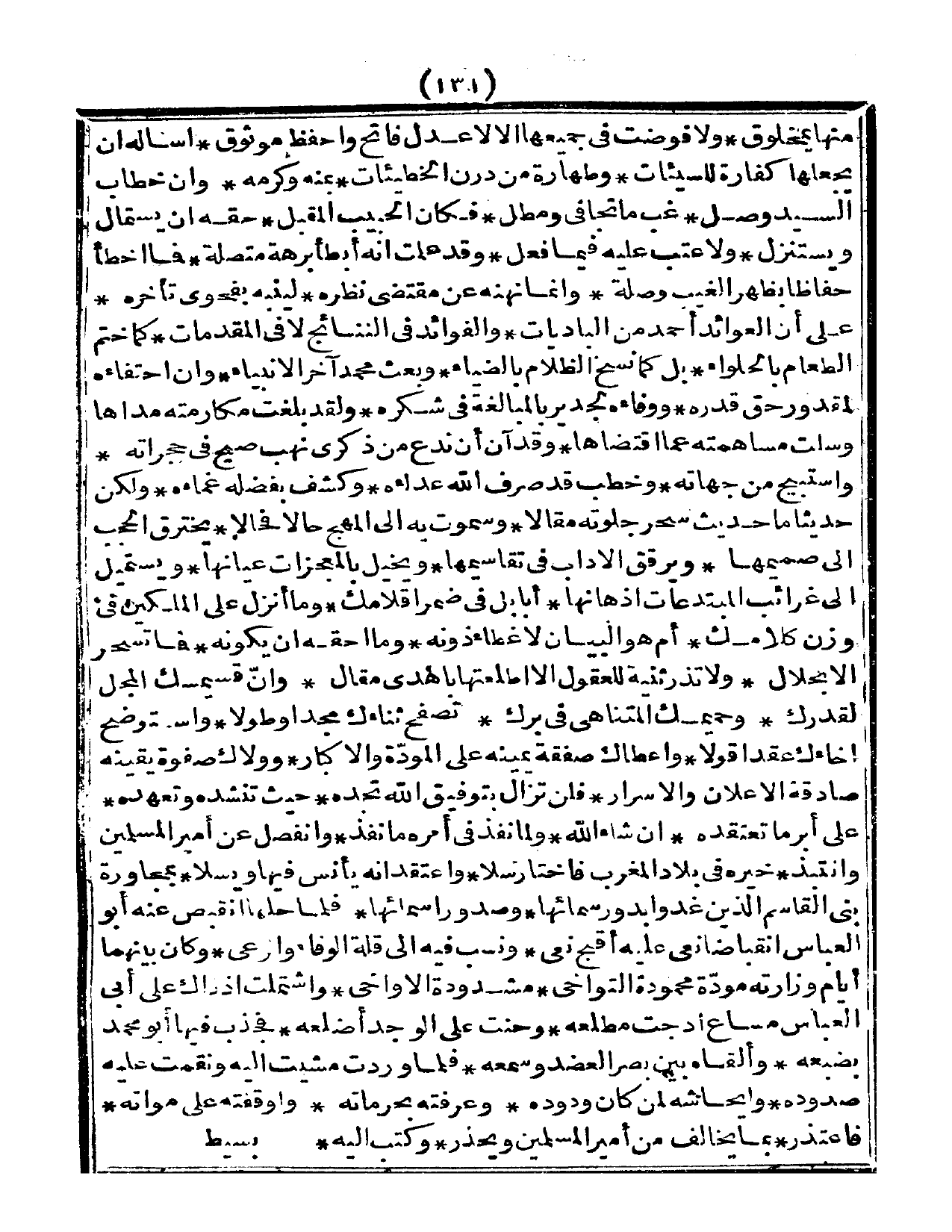 منها بمخلوق، ولا فوضت في جميعها إلا لأعدل فاتح وأحفظ موثوق، أسأله أن يجعلها كفارة للسيئات، وطهارة من دون الخطيئات، بمنه وكرمه، وأن خطاب السيد وصل، غب ما تجافى ومطل، فكان لحبيب المقبل، حقه أن يستمال ويستننزل، ولا عيب عليه فيما فعل، وقد علمت أنه أبطاً برهة متصلة، فما أخطا حفاظاً بظهر الغيب وصلة، وإنما نهنه عن مقتضى نظره، لينبه بفحوى تأخره، على أن العوائد أحمد من الباديات، والفوائد في النتائج لا في المقدمات، كما ختم الطعام بالحلواء، بل كما نسخ الكلام بالضياء، وبعث محمد آخر الأنبياء، وأن اختفاءه لمقدور حق قدره، ووفاءه لجدير بالمبالغة في شكره، ولقد بلغت مكارمته مداها، وسلت مساهمته عما اقتضاها، وقد آن أن ندع في ذكرى نهب صيح في حجراته، واستبيح من جهاته، وخطب وقد صرف الله عدآءه، وكشف بفضله غماءه، ولكن حديثاً ما حديث سحر جلوته مقالا، وسموت به إلى المهج حالا فحالا، يخترق الحجب إلى صميمها، ويرفق الآداب في تقاسيمها، ويخيل بالمعجزات عيانها، ويستميل إلى غرائب المبدعات أذهانها، ابابل في ضمير أقلامك، وما أنزل على الملكين في وزن كلامك، أم هو البيان لا غطاء دونه، وما أحقه أن يكونه، فما تسحر إلا بحلال، ولا تذر ثنية للعقول إلا أطلعتها بأهدى مقال: وإن قسيمك المجل لقدرك، وحميمك المتناهي في برك، تصفح ثناءك مجداً وطولاً، واستوضح أخاك عقداً وقولاً وأعطاك صفقة يمينه على المودة والإكبار، وولاك صفوة يقينه صادقة الإعلان والأسرار، فلن تزال بتوفيق الله ومجده، حيث تنشده وتعهده، على إبر ما تعتقده، إن شاء الله، ولما نفذ في أمره ما نفذ، وانفصل عن أمير المسلمين وانتبذ، خيرة في بلاد المغرب فاختار سلا، واعتقد أنه يانس فيها ويسلا، بمجاورة بني القاسم الذين غدوا بدور سمائها، وصدور سمائها، فلما حلها انقبض عليه أبو لعباس انقباضا تعي عليه أقبح نعي، ونسب فيه إلى قلة الوفاء والرعي، وكان بينهما أيام وزارته مودة محمودة التواخي، مشدودة الأواخي، واشتملت إذ ذاك على أبي العباس مساع أدجت مطلعه، وحنت على الوجد أضلعه، فجذب فيها أبو محمد بضبعه، والقاه بين بصر العضد وسمعه، فلما وردت مشيت إليه ونقمت عليه صدوده، وإيحاشة لمن كان ودوده، وعرفته بحرماته، وأوقفته على مواته، فاعتذر، بما يخاف من أمير المسلمين ويحذر، وكتب إليه، بسيط