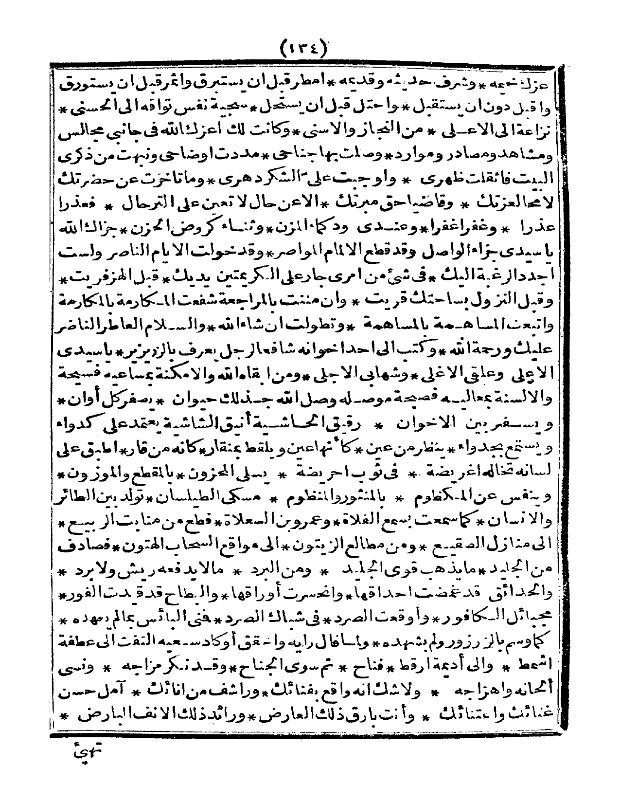 عزك خيمه، وشرف حديثه وقديمه، أمط قبل أن يستبرق، وأثمر قبل أن يستورق، وأقبل دون أن يستقبل، واحتل قبل أن يستحل، سجية نفس تواقة إلى الحسنى، نزاعة إلى الأعلى، من النحار والأسنى، وكانت لك أعزك الله في جانبي مجالس ومشاهد، ومصادر وموارد، وصلت بها جناحي، مددت أوضاحي، ونبهت من ذكري البيت فأثقلت ظهري، وأوجبت علي الشكر دهري، وما تأخرت عن حضرتك لامحا لعزتك، وقاضياً حق مبرتك، ألا عن حال، لا تعين على الترحال، فعذرا عذرا، وغفرا غفرا، وعندي ود كماء المزن، وثناء كروض الحزن، جزاك الله يا سيدي جزاء الواصل وقد قطع الإلمام المواصر، وقد خولت الأيام الناصر، ولست أجدد الرغبة إليك، في شيء من أمري جار على الكريمتين يديك، قبل الهزفريت، وقبل النزول بساحتك قريت، وإن مننت بالمراجعة شفعت المكارمة بالمكارمة، واتبعت المساهمة بالمساهمة، وتطولت إن شاء الله، والسلام العاطر الناضر عليك ورحمة الله، وكتب إلى أحد إخوانه شافعاً لرجل يعرف بالزريزير، يا سيدي الأعلى، وعلقي الأغلى، وشهابي الأجلى، ومن أبقاه الله والأمكنة بمساعيه فسيحة، والألسنة بمعاليه فصيحة، موصله وصل الله جذلك حيوان، يصفر كل أوان، ويسفر بين الإخوان، رقيق الحاشية، أنيق الشاشية، يعتمد على كدواء، ويستمع بجدواء، ينظر من عين، كأنها عين، ويلقط بمنقار، كأنه من قار، أطبق على لسانه تخاله أغريضة، في ثوب أحريضة، يسلي المحزون، بالمقطع والموزون، ينفس عن المكظوم، بالمنثور والمنظوم، مسكي الطيلسان، تولد بين الطائر والإنسان، كما سمعت بسمع الفلاة، وعمر ابن السعلاة، قطع من منابت الربيع، إلى منازل الصقيع، ومن مطالع الزيتون، إلى مواقع السحاب الهتون، فصادف من الجليد، ما يذهب قوى الجليد، ومن البرد، ما لا يدفعه ريش ولا برد، والحدائق قد أغمضت أحداقها، وانحسرت أوراقها، والبطاح قد قيدت الفور، بحبائل الكافور، وأرقعت الصرد، فمني البائس بما لم يعهده، كما وسم بالزرزور ولم يشهده، ولما فال رأيه وأخفق أو كاد سعيه التفت إلى عطفة أشمط، وإلى أديمه أرقط، فناح، ثم سوى الجناح، وقد نكر مزاجه، ونسي ألحانه وأهزاجه، ولا شك أنه واقع بفنائك، وراشف من إنائك، أمل حسن غنائك واعتنائك، وأنت بارق ذلك العارض، ورائد ذلك الأنف البارض،