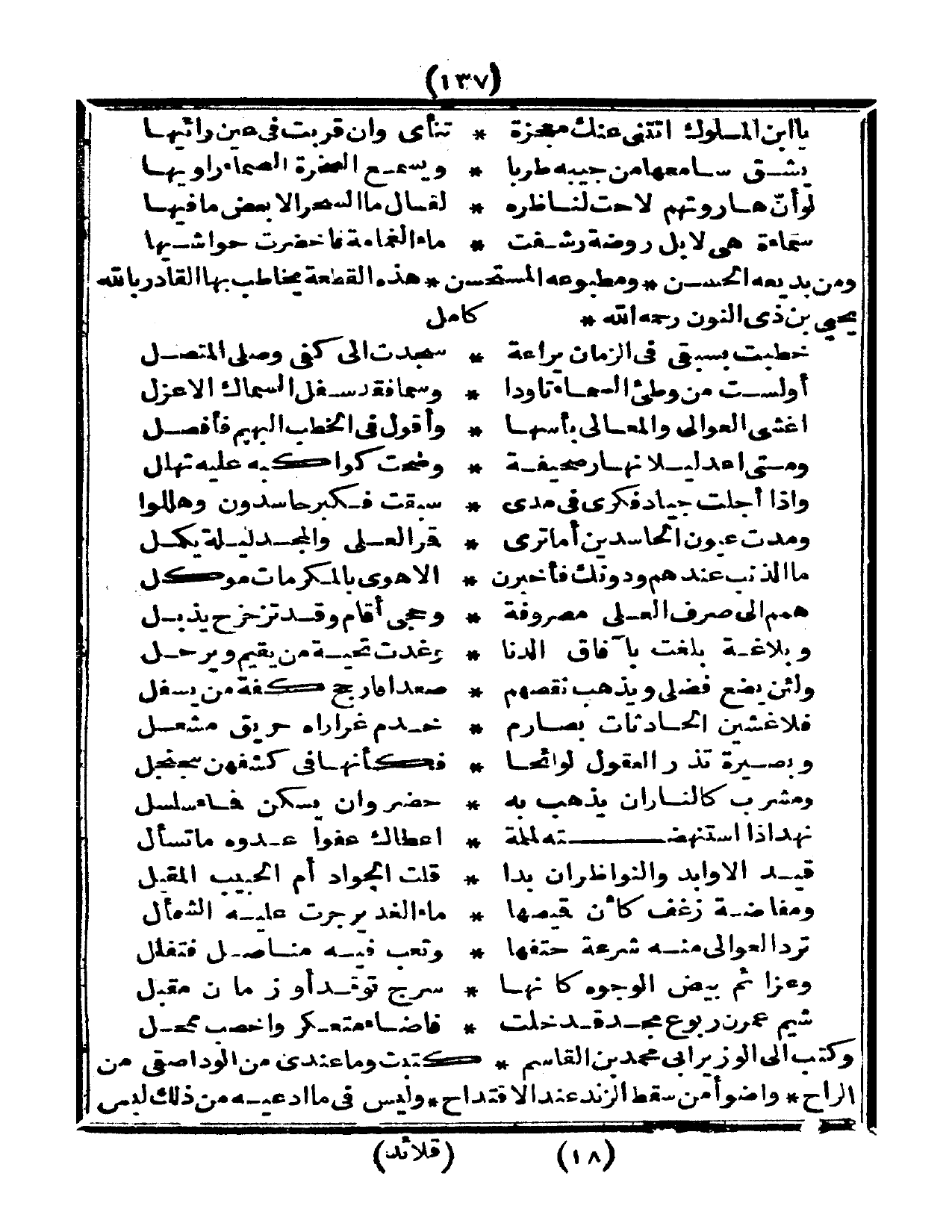 ومن بديعه الحسن، ومطبوعه المستحسن، هذه القطعة يخاطب بها القادر بالله يحيى ابن ذي النون رحمه الله، كامل