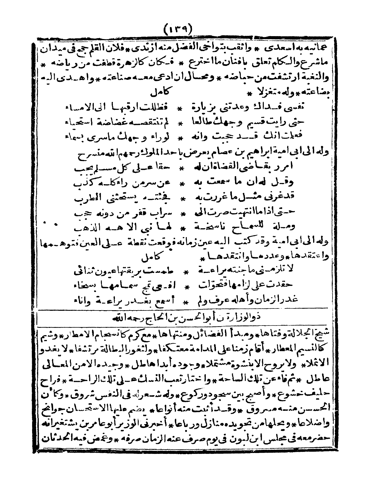 عما نبه به أسعدي، وأثقب بتواخي الفضل منه أزندي، فلان القلم جمح في ميدان ما شرع، والكلم تعلق بأفنان من اخترع، فكان كالزهرة قطفت من رياضه، والنبغة ارتشفت من حياضه، ومحال أن أدعي معه صناعته، وأهدي إليه بضاعته، وله متغزلا، كامل