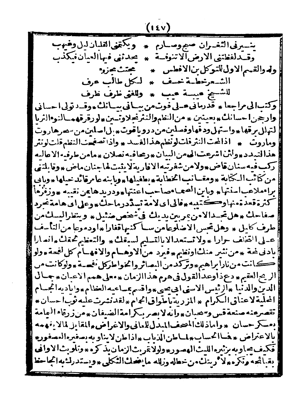 وكتب إليّ مراجعاً قد رماني على فوت من بياني بيانك وقد تولّى إحساني وأرجحنّ إحسانك بعينين من النظم والنثر نجلاوتين لو رقرقهما لنوء الثريا لتهلل برقها واستهلّ ودقها وفصلين من در وياقوت بل أصلين من سحر هاروت وماروت إذا لمحت النثر قلت لو نظم هذا لفسد وإذا تصفحت النظم قلت لو نثر هذا لتبدد ولئن أشرعت إليّ من البيان رمحا فيه نصلان ما من طرفيه إلا عاليه ركب فيه سنان قاض ولا من شفرتيه إلا فارية لا يثبت لها جنان ماض وقابلتني من كتائب الكتابة ومقانب الخطابة بطفيلها وبابنه عامر قائد خيلها وبابي براء ملاعب أسنتها وبابن الصماء صاحب أعنتها ودريدها يمن نقيبه وزفرها كثرة قعدة منها وكتيبه فإلى أي لامة تسدد رماحك وعلى أي هامة تجرد صفاحك هل تجد إلا من يمر بين يديك في شخص ضئيل وينظر إليك من طرف كليل وهل تجس إلا ضلوعاً من ساكنيها قفارا أو دموعاً من التاسف على التخلف حرارا ولا تستعد إلا بالتسليم لسبقك والتعظيم لحقك أنصاراً بادني لمحة من نثير منك أو نظيم فيرد من الأوهام والأفهام كل لفحة ولو كانت من نار إبرهيم وتركد من البصائر والخواطر كلّ نفحة ولو كانت من الريح العقيم دع ذا وعد القول في هرم هذا الزمان معليّ همم الأعيان جمال الدين والدنيا الرئيسي الأسنى أبي يحيى وأقسم بمساعيه العظام وأياديه الجسام المحليّة لأعناق الكرام المزرية بأطواق الحمام لقد نشرت عليه ثوب إحسان تقصر عنه صنعة قس وسحبان وأنه لا بصر بكرامة الضيفان من زرقاء اليمامة بعسكر حسان وأما ذلك المصحف المبدل للمعاني والأغراض المقابل لما لا يفهمه بالاعتراض فما الحساب لما طنّ الذباب إذا طنّ لا يناوبه بصفيره العصفور فكيف يجاوبه بزئيره الليث الهصور ولولا تمريث الزمان بذكره وتلويث الأواني بقبائحه ونكره لرأيتك من خطله وزلله ما يضحك الثكلى ويستدرك به الجاحظ