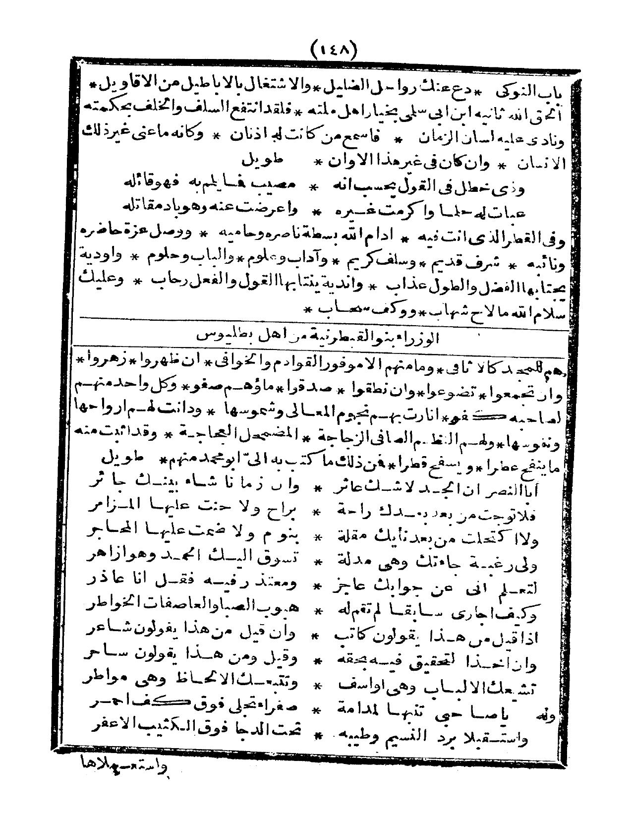 باب النوكى دع عنك رواحل الضليل والأشغال بالأباطيل من الأقاويل الحق الله ثانيه ابن أبي سلمى بخيار أهل ملّته فلقد انتفع السلف والخلف بحكمته ونادى عليه لسان الزمان فاسمع من كانت له أذنان وكأنه ما عني غير ذلك الإنسان وإن كان في غير هذا الأوان. طويل