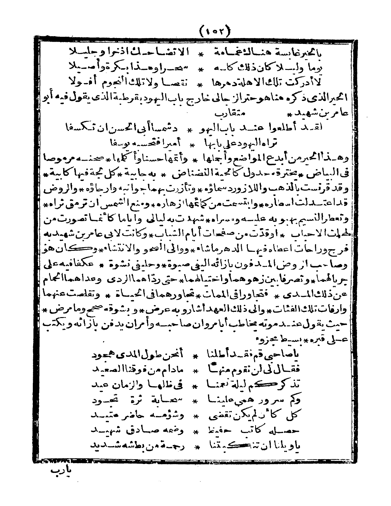 وهذا الحير من أبدع المواضع وأجملها، وأتمها حسناً وأكملها، صحنه مرموصاً في البياض، يخترقه جدول كالحية النضناض، به جابية، كل لجة فيها كابية، وقد قرنست بالذهب واللازورد سماؤه، وتأزرت بهما جوانبه وأرجاءه، والروض قد اعتدلت أسطاره، وابتسمت من كمائمها أزهاره، ومنع الشمس أن ترمق ثراه، وتعطر النسيم بهبوبه عليه ومسراه، شهدت به ليالي وأياما كأنما تصورت من لمحات الأحباب، أو قدت من صفحات أيام الشباب، وكانت لأبي عامر بن شهيد به فرج وراحات أعطاه فيها الدهر ما شاء، ووالى الصحو والانتشاء، وكان هو وصاحب الروض المدفون بازائه اليفي صبوة، وحليفي نشوة، عكفا فيه على جريالهما، وتصرفا بين زهرهما واختيالهما، حتى رداهما الردى، وعداهما الحمام عن ذلك المدى، فتجاورا في الممات، تجاورهما في الحيرة، وتقلصت عنهما وارفات تلك الفيئات، وإلى ذلك العهد أشار وبه عرض، وبشوقه صحح وما مرض، حيث يقول عند موته يخاطب أبا مروان صاحبه وأمر أن يدفن بازائه ويكتب على قبره: بسيط مجزوء