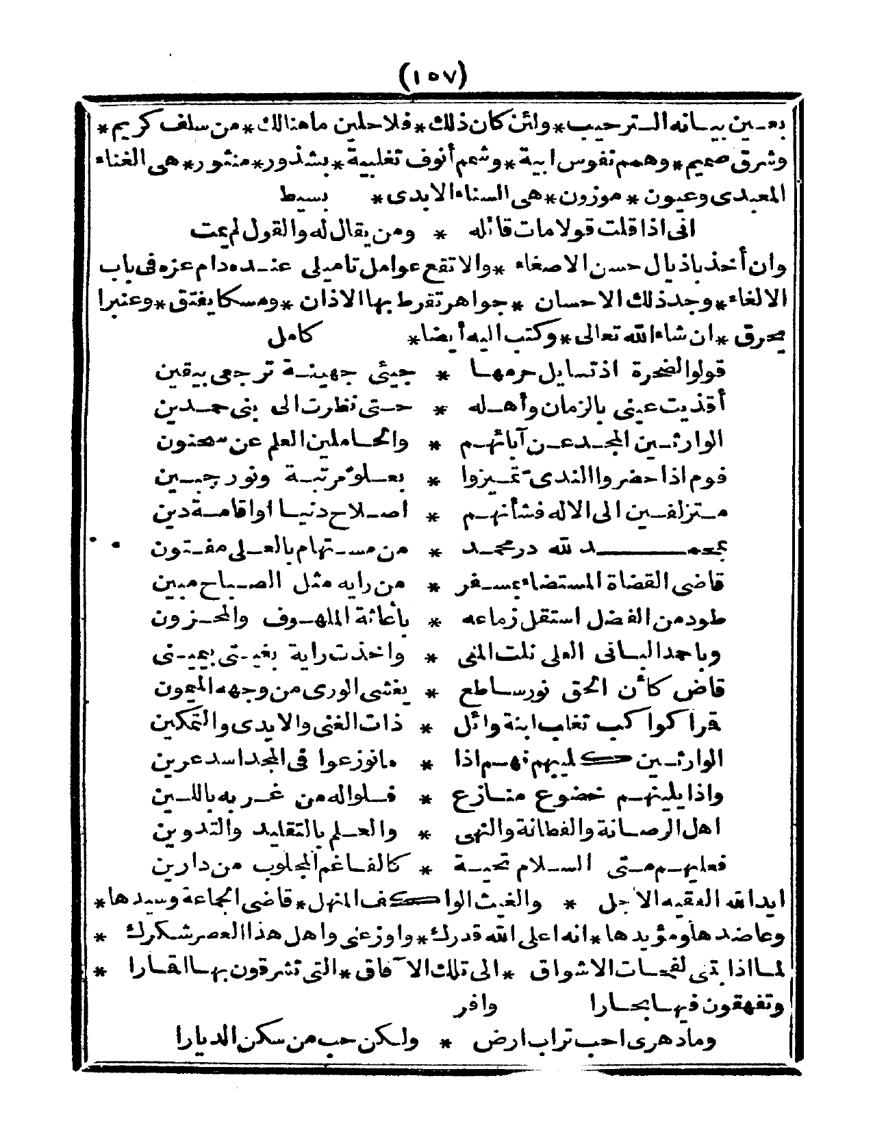 بعين بيانه لترحيب، ولئن كان ذلك، فلأحليّن ما هنالك، من سلف كريم، وشرف صميم، وهمم نفوس أبيّة، وشمم أنوف تغلبية، بشذور، منشور، هي الغناء المعبدي وعيون، موزون، هي السناء الأبدي. بسيط