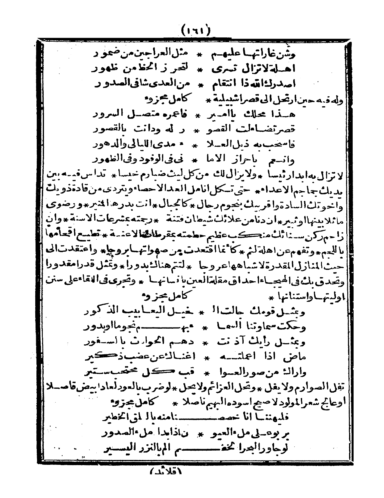 لا تزال به أبداً رئيساً ولا يزال لك من كل ليث ضبارم خيسا تداس فيه بين يديك جماجم الأعداء، حتى تكل أنامل العد والأحصاء ويتردى من قادة ذويك وأخوتك السادة وأقربيك بنجوم رجال كالجبال أنت بدرها المنير ورضوى ماثلا بينها أو ثبير أن دنا من علائك شيطان فتنة رجمته بمشرعات الأسنة، وأن زحم ركن سنائك منكب عظيم حطمته بمقرطات الأعنة، تطيع أقحامها باللحم، وتفهم عن أهله لثم، كأنما اقتعدت من صهواتها بروجاً، واعتقدت إلى حيث المنازل المقدرة لأشباهها عروجا لتتم هناك بدورا وتمثل قدراً مقدوراً، وتحدق بك في الهيجاء أحداق مقلة العين بأنسابها وتجري في اللقاء على سنن أوليتها واستنابها. كامل مجزوء