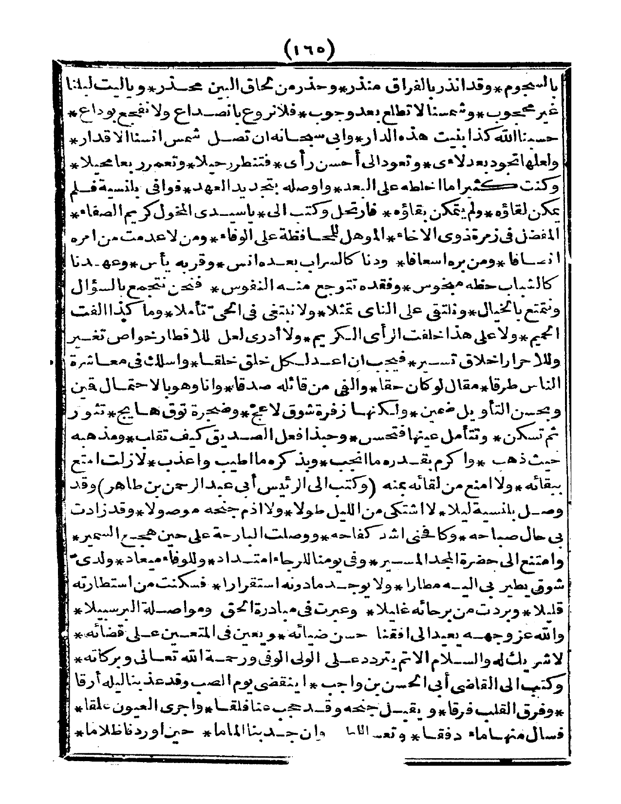 بالسجوم، وقد أذنر بالفراق منذر، وحذر من لحاق البين محذر، ويا ليت ليلنا غير محجوب وشمسنا لا تطلع بعد وجوب، فلا نروع بانصداع ولا نفجع بوداع، حسبنا الله كذا بنيت هذه الدار، وابني سبحانه أن تصل شمس أنسنا الأقدار ولعلها تجود بعد لأي، وتعود إلى احسن رأي، فتنطر رحيلا، وتعمر ربعا محيلا، وكنت كثيراً ما أخاطبه على البعد، وأواصله بتجديد العهد، فوافى بلنسية فلم يمكن لقاؤه، ولم يتمكن بقاؤه، فارتحل وكتب إلي، يا سيدي المخول كريم الصفاء، المفضل في زمرة ذوي الخاء، الموهل للمحافظة على الوفاء، ومن لا عدمت من أمره أنصافاً، ومن بره أسعافا، ودنا كالسراب بعده أنس، وقربه يأس، وعهدنا كالشباب حظه مبخوس، وفقده تتوجع منه النفوس، فنحن نتجمع بالسؤال، ونتمتع بالخيال، ونلتقي على الناي تمثلاً، ولا نبتغي في الحي تأملا، وما كذا الفت الحميم، ولا على هذا خلفت الرأي الكريم، ولا ادري لعل الأقطار خواص تغير، وللأحرار أخلاق تسير، فيجب أن أعد لكل خلق خلقا، واسلك في معاشرة الناس طرقا، مقال لو كان حقا، وألفي من قائله صدقا، وأنا وهو بالاحتمال قمين، وبحسن التأويل ضمين، ولكنها زفرة شوق لعج، وضجرة توق هأيج، تثور ثم تسكن، وتتأمل عينها فتحسن، وحبذا فعل الصديق كيف تقلب، ومذهبة حيث ذهب، وأكرم بقدره ما انجب، وبذكره ما أطيب وأعذب، لازلت أمتع ببقائه، ولا أمنع من لقائه، بمنه، وكتب إلى الرئيس أبي عبد الرحمن بن طاهر وقد وصل بلنسية ليلاً، لا اشتكي من اليل طولا، ولا أذم جنحه موصولا، وقد زادت بي حال صباحه، وكافحني أشد كفاحه، ووصلت البارحة على حين هجع السمير، وامتنع إلى حذرة المجد المسير، وفي يومنا للرجاء امتداد، وللوفاء ميعاد، ولدي شوق يطير بي إليه مطارا، ولا يوجد ما دونه استقرار، فسكنت من استطارته قليلاً، وبردت من برحائه غليلا، وعبرت في مبادرة الحق ومواصلة البرسبيلا، والله عز وجهه يعيد إلى أفقنا حسن ضيائه، ويعين في المتعين على قضائه، لا شريك له والسلام الأتم يتردد على الولي الوفي ورحمة الله تعالى وبكاته، وكتب إلى القاضي أبي الحسن بن واجب، أينقضي يوم الصب وقد عذبنا ليلة أرقا، وفرق القلب فرقا، ويقبل جنحه وقد حجب عنا فلقا، واجرى العيون علقا، فسال منها ماء دفقا، وتعسا للمطي وان جد بنا الماما، حين أوردنا ظلاما،