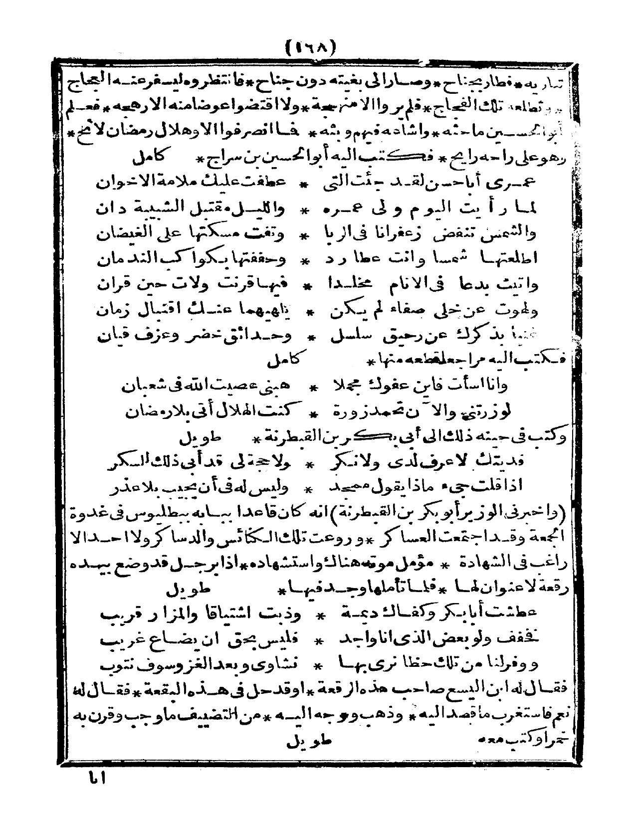 تباريه، فطار بجناح، وصار إلى بغيته دون جناح، فانتظروه ليسفر عنه العجاج، وتطلعه تلك الفجاج، فلم يروا إلا منهجه، ولا اقتضوا عوضاً منه إلا رهجه، فعلم أبو الحسين ما حثه، وأشاعه فيهم وبثه، فما أنصرفوا إلا وهلال رمضام لائح، وهو على راحة رائح، فكتب إليه أبو الحسين ابن سراج: كامل