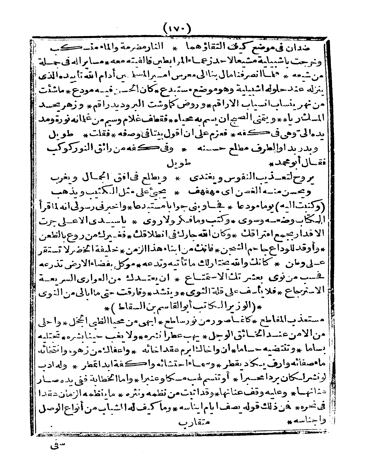 وكتبت إليه يوماً مودعا، فجاوبني جواباً مستبدعا، وأخبرني رسولي أنه لما قرأ الكتاب وضعه وسوى، وكتب وما فكر ولا روى، ياسيدي الأعلى جرت الأقدار بجمع أفتراقط، وكان الله جارك في انطلاقك، فيغرك من روع بالظعن، وأوقد للوداع جاحم الشجن، فانك من أبناء هذا الزمن، خليفة الخضر لا تستقر على وطن، كأنك والله يختار لك ما تأتيه وتدعه، موكل بفضاء الأرض تذرعه، فحسب من نوى بعشرتك الاستمتاع، أن يعتدك من العواري السريعة الاسترجاع، فلا يأسف على قلة الثرى، وينشد، وفارقت حتى ما أبالي من النوى.