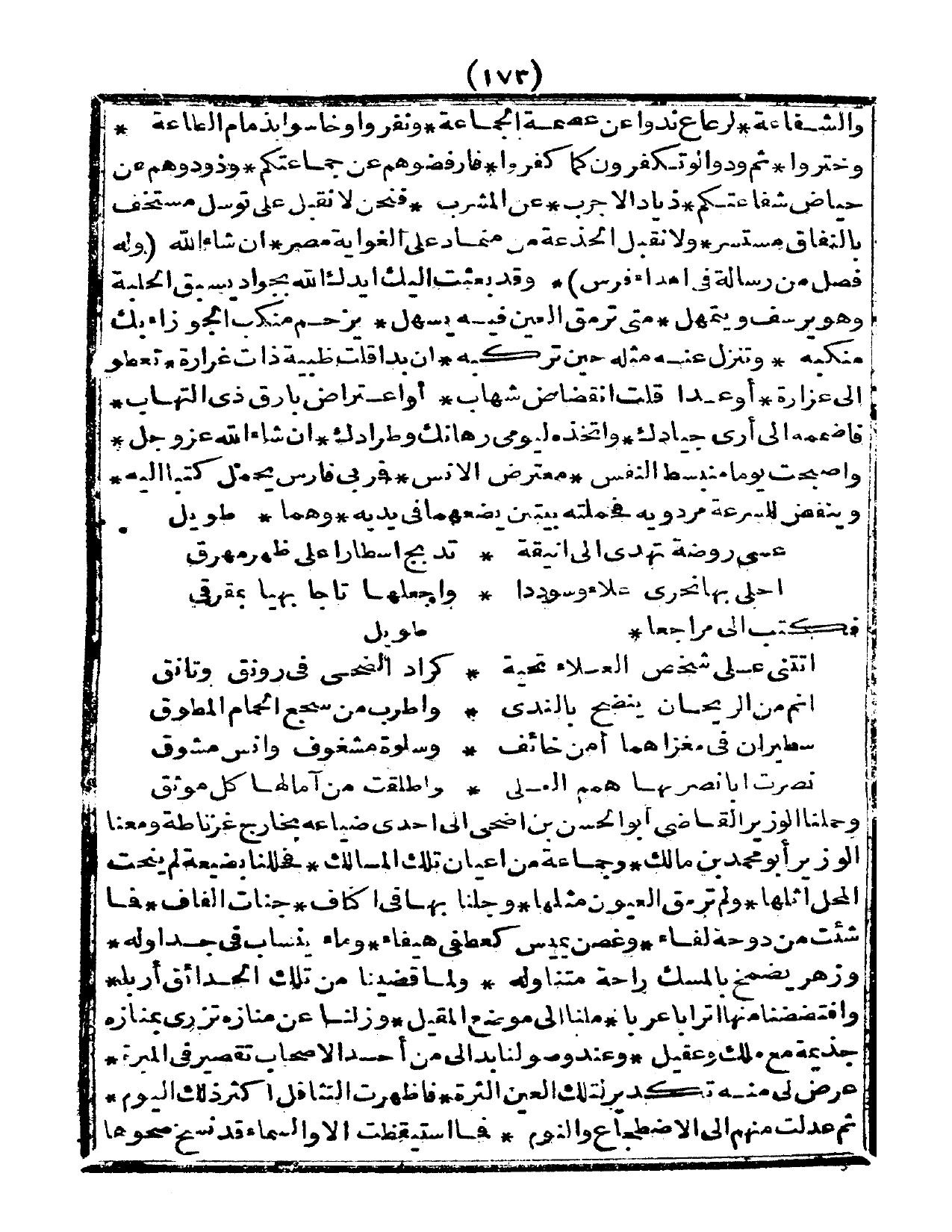 والشفاعة، لرعاع ندوا عن عصمة الجماعة، ونفروا، وخاسوا بذمام الطاعة، وختروا، ثم ودوا لو تفكرون كما كفروا، فأرضوهم عن جماعتكم، وذودوهم عن حياض شفاعتكم، ذياد الأجرب، عن المشرب فنحن لا نقبل على توسل مستخف بالنفاق مستسر، ولا نقبل الحذعة من متماد على الغواية مصر، أن شاء الله، وله فصل من رسالة في أهداء فرس، وقد بعثت إليك أيدك الله بجواد يسبق الحلبة وهو يوسف ويتمهل، متى ترمق العين فيه تسهل، يزحم منكب الجوزاء بك منكبه، وتنزل عنه حين تركبه، أن بدا قلت ظبية ذات غرارة، تعطو إلى غرارة، أو عدا قلت انقضاض شهاب، أو اعتراض بارق ذي التهاب، فاضممه إلى أرى جيادك، واتخذه ليومي رهانك وطرادك، أن شاء الله عز وجل وأصبحت يوماً منبسط النفس، معترض الأنس، فمر بي فارس يحمل كتبا إليه، وينفض للسرعة مردويه، فحملته بيتين يضعهما في يديه وهما: طويل