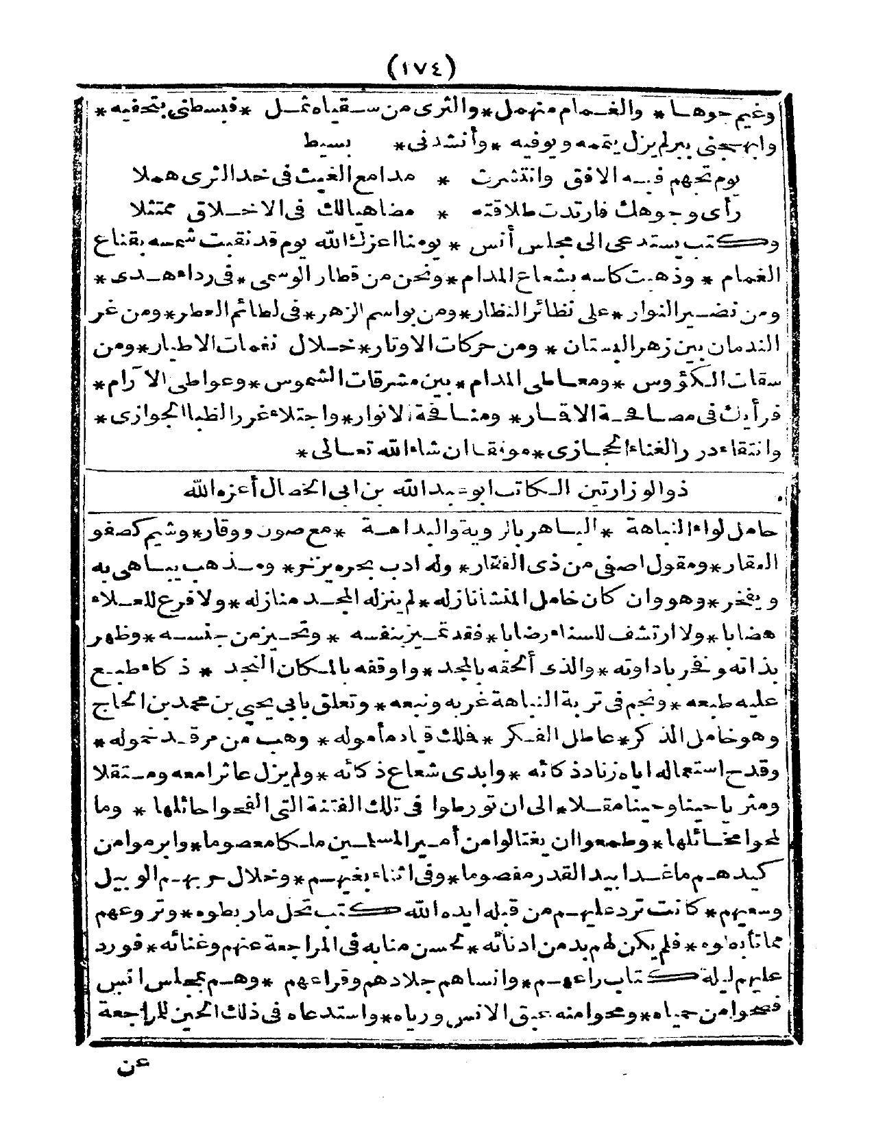 وكتب يستدعي إلى مجلس انس، يومنا أعزك الله يوم قد نقبت شمسه بقناع الغمام، وذهبت كاسه بشعاع المدام، ونحن من قطار الوسمي، في رداء هدي، ومن نضير النوار على نظائر النظار، ومن بواسم الزهر، في لطائم العطر، ومن غر الندمان بين زهر البستان، ومن حركات الأوتار، خلال نغمات الأطيار، ومن سقات الكؤس، ومعاطي المدام، بين مشرقات الشموس، وعواطي الأرام، فرأيك في مصافحة الأقمار، ومنافجة الأنوار، واجتلاء غرر الظباء الجوازي، وانتقاد درر الغناء الحجازي، موفقا أن شاء الله تعالى.