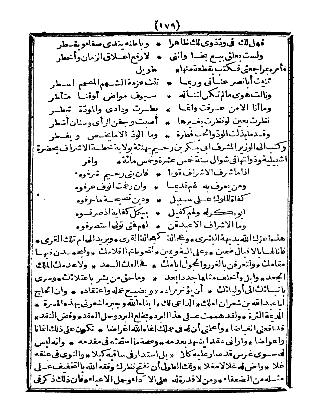هذه أعزك اله بديهة البشرى، وعجالة كعجالة القرى، وبريد إلى أم تلك القرى، فأنا لها بالإقبال ضمين، وعلي إليه ويمين، لتحوطنها أقلامك، وليحمدن فيها مقامك، ولتعرفن بالغرر والحجول أيامك، فحالفك السعد، ولاعدمك الملك الجعد، وأبل وأخلف مثلها جددا بعد، وما حق من بشر با بأعتلاتك، وسرى بأنبائك إلى أوليائك، أن يؤخر مراده، ويضيع عمله واعتقاده، وان الحاج أبا عبد الله بن شعران أملك، الداعي لك، أبقاه الله وجبره أشعرني بهذه المسرة، والديمة الثرة، ولقد هممت على هذا البرد، بخلع البرد، وحل العقد، وفض النقد، فدافعني انقباضا، وأعلمني أن له في علمك أنماه الله أغراضا، تكون على ذلك أثماناً وأعواضاً، وأراني عقداً يشهد بعدمه وصحة ما استحثه في مقدمة، وأنه ليس له سوى غرس قد صار عليه كلا، بل استدار في ساقيه كبلا، والتوى في عنقه غلا، وعاض له غلا لا مغلا، ولك الطول أن تفتح نظرك وفقه الله بالتخفيف على مثله من الضعفاء، ومن لا قدرة له على الأداء، وحمل الأعباء فإن ذلك ذكر في