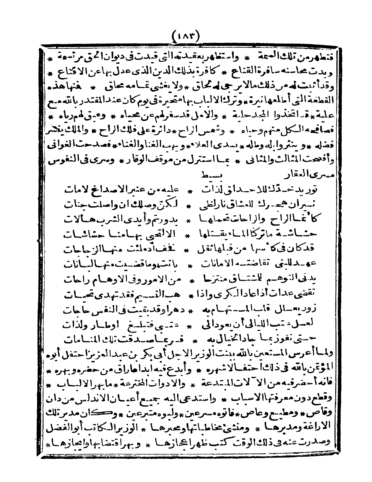 فتطهر من تلك السمة، واستظهر بعقيدته التي قيدت في ديوان الحق مرتسمة، وبدت محاسنه سافرة القناع، كافرة بذلك الدين الذي عدل بها من الإقناع، وقد أثبت له من ذلك مالا يرجى له لحاق، ولا يغشي تمامه محاق، فمنها هذه القطعة التي أطلعها نيرة، وترك الأباب بها متحيرة، في يوم كان عند المقتدر بالله مع علية، قد اتخذوا المجد حلية، والأمل قد سفر لهم عن محياة، وعبق لهم رياه، فصافحه الكل منهم وحياه، وشمس الراح، دائرة على فلك الراح، والملك ينشر فضله، وينثر وأبله وطله، يسدي العلاء، ويهب الغنا والغناء، فصدحت الغواني، وأفصحت المثالث والمثاني، بما استنزل من موقف الوقار، وسرى في النفوس مسرى العقار. بسيط
