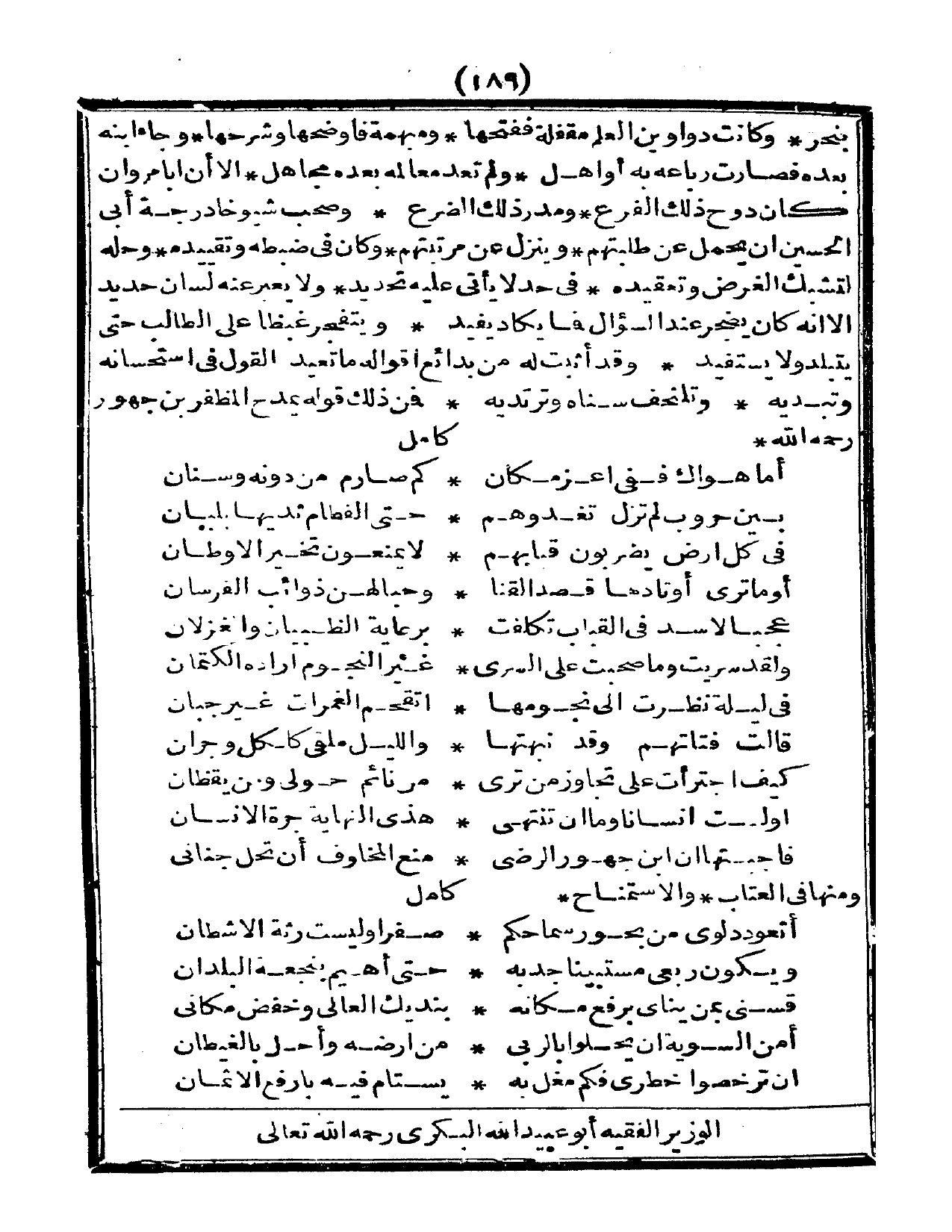 بنحر، وكانت دواوين العلم مقفلة ففتحها، ومبهمة فأوضحها وشرحها، وجاء ابنه بعده فصارت رباعه به أواهل، ولم تعد معالمه بعده مجاهل، إلا أن أبا مروان كان دوح ذلك الفرع، ومدر ذلك الضرع، وصحب شيوخاً درجة أبي الحسين أن يحمل عن طلبتهم، وينزل عن مرتبهم، وكان في ضبطه وتقييده، وحله لتشبك الغرض وتعقيده، في حد لا يأتي عليه تحديد، ولا يعبر لسان حديد، إلا أنه كان يضجر عند السؤال فما يكاد يفيد، ويتفجر غيظاً على الطالب حتى يتبلد ولا يستفيد، وقد أثبت له من بدائع أقواله ما تعيد القول في استحسانه وتبديه، وتلتحف سناه وترتديه، فمن ذلك قوله يمدح المظفر بن جهور رحمه الله. كامل