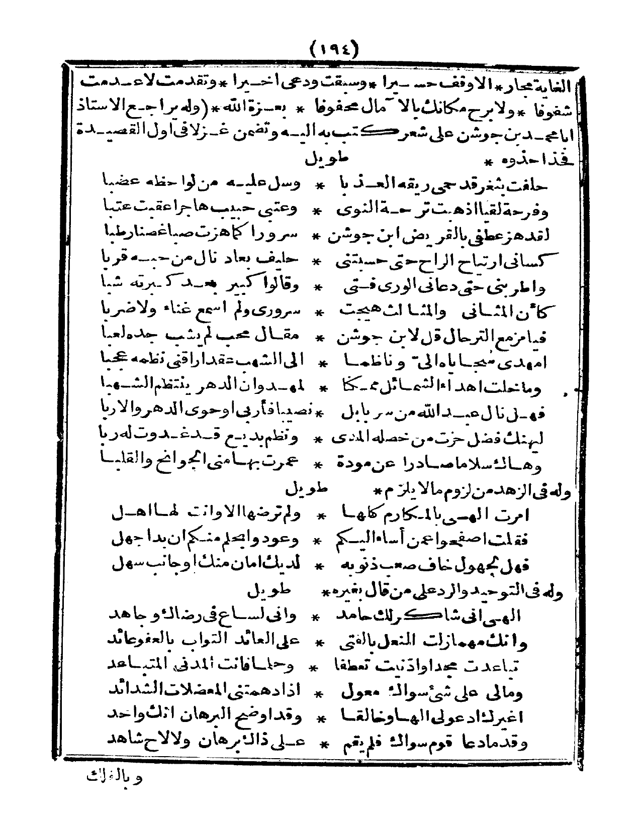 الغاية شفوفاً، ولا برح مكانك بالآمال محفوفاً، بعزة الله، وله يراجع الأستاذ أبا محمد بن جوشن على شعر كتب به إليه وتضمن غزلاً في أول القصيدة فحذا حذوه: طويل