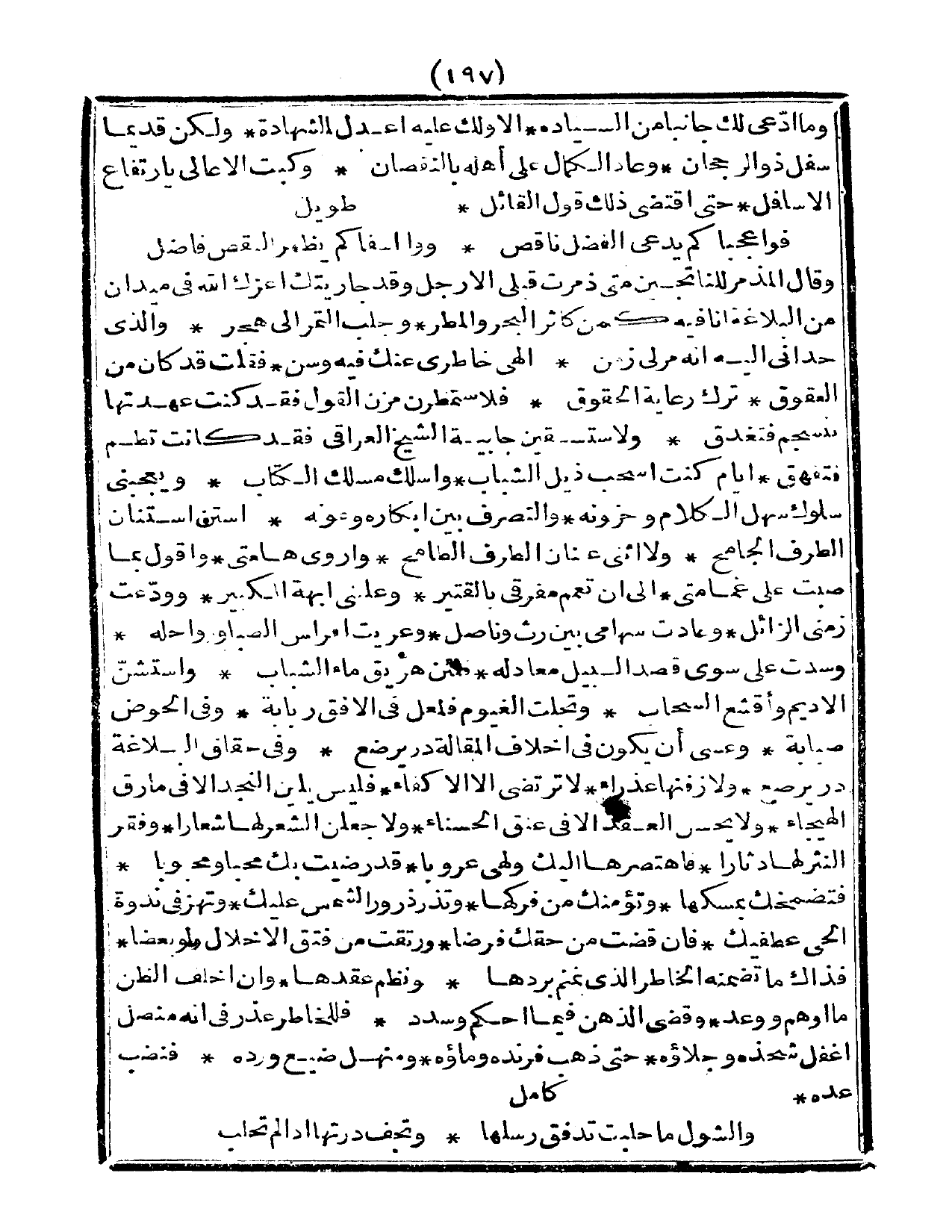 وما أدعى لك جانبا من السيادة، إلا ولك عليه أعدل الشهادة، ولكن قديما سفل ذو الرجحان، وعاد الكمال على أهله بالنقصان، وكبت الأعالي بارتفاع الأسافل، حتى اقتضى ذلك قول القائل: طويل