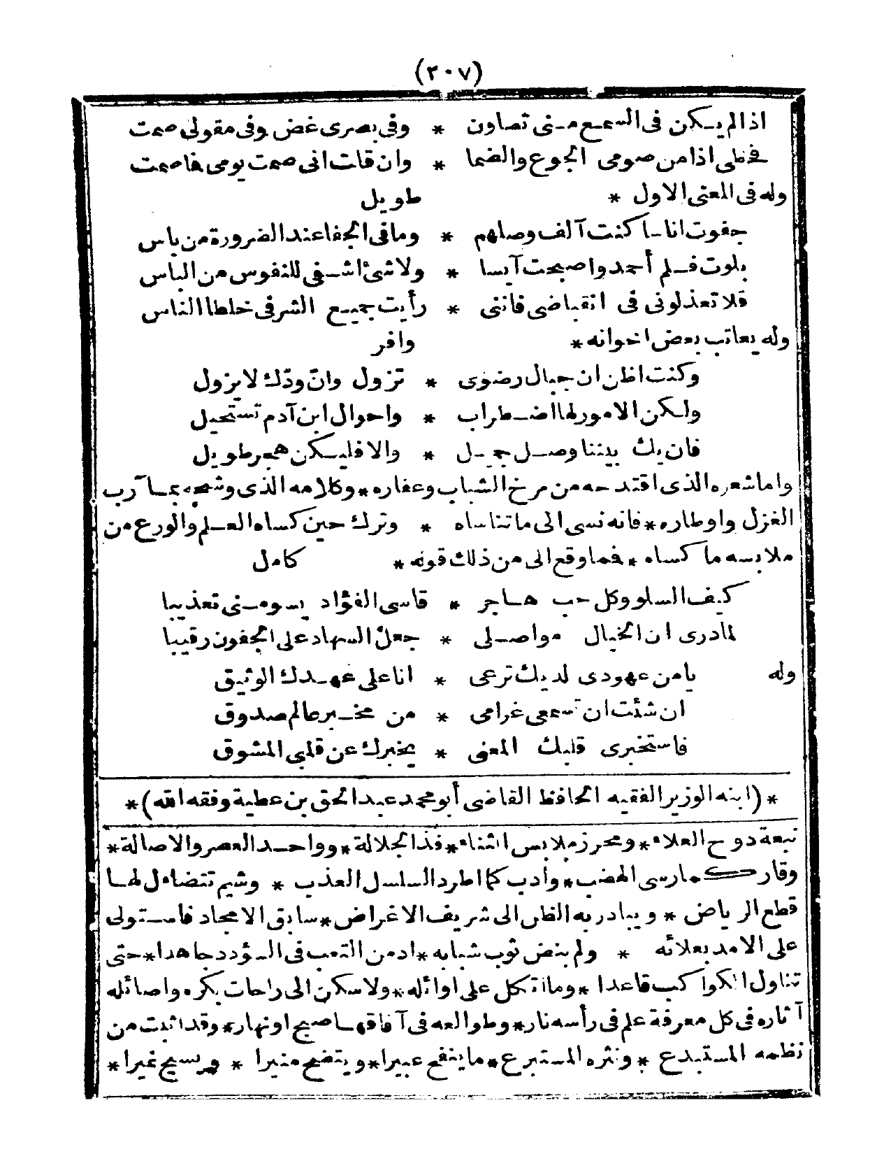نبعة دوح العلاء، ومحرز ملابس الثناء، فذ الجلالة، وواحد العصر والإصالة، وقار كما رسى الهضب، وأدب كما أطرد السلسل العذب، وشيم تتضاءل لها قطع الرياض، ويبادر به الظن إلى شريف الأغراض، سابق الأمجاد فاستولى على الأمد بعلائه، ولم ينض ثوب شبابه، أدمن التعب في السودد جاهدا، حتى تناول الكواكب قاعدا، وما أثكل على أوائله، ولا سكن إلى راحات بكره وأصائله، أثاره في كل معرفة علم في رأسه نار، وطوالعه في أفاقها صبح أو نهار، وقد اثبت من نظمه المستبده ونثره المستبرع، ما ينفح عبيرا، ويتضح منبرا، ويسيح نميرا،