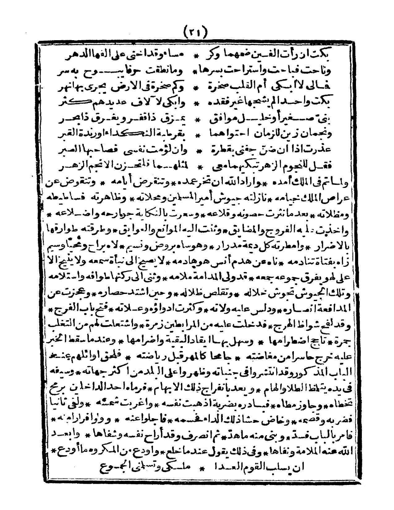 ولما تم في الملك أمك، وأراد الله أن تخر عمك، وتنقرض أيامه، وتتقوض عن عراص الملك خيامه، نازلته جيوش أمير المسلمين ومحلاته، وظاهرته فساطيطه ومظلاته، بعدما نثرت حصونه وقلاعه، وسعرت بالنكاية جوارحه وأضلاعه، وأخذت عليه الفروج والمضائق، وثنت إليه الموانع والعوائق، وطرقته بالأضرار، وأمطرته كل ديمة مدرار، وهو ساه بروض ونسيم، لاه براح ومحبباً وسيم، زاه بفتاة تنادمه، ناه عن هدم أنس هو هادمه، لا يصيخ إلى نبأة سمعه، ولا ينيخ إلا على لهو يفرق جموعه جمعه، قد ولى المدامة ملامه، وثنى إلى ركنها طوافه واستلامه، وتلك الجيوش تجوش خلاله، وتقلص ظلاله، محين اشتد حصاره، وعجزت عن المدافعة أنصاره، ودلس عليه ولاته، وكثرت أدواؤه وعلاته، فتح باب الفرج، وقد لفح شواظ الهرج، فدخلت عليه من المرابطين زمرة، واشتعلت لهم من التغلب جمرة، تأجج اضطرامها، وسهل بها إيقاد البقية وإضرامها، وعندما سقط الخبر عليه خرج حاسراً من مفاضته، جامحاً كالمهر قبل رياضته، فلحق أوائلهم عند الباب المذكور وقد انتشروا في جنباته، وظهروا على البلد من أكثر جهاته، وسيفه في يده يتلمظ الطلا والهام، ويعد بانفراج ذلك الإبهام، فرماه أحد الداخلين برمح تخطاه، وجاوز مطاه، فبادره بضربه أذهبت نفسه، وأغربت شمسه، ولقي ثانياً فضربه وقصمه، وخاض حشا ذلك الداء فحمسه، فأجلوا عنه، وولوا فراراً منه، فأمر بالباب فسد، وبني منه ماهد، ثم انصرف وقد أراح نفسه وسفاها، وأبعد الله عنه الملامة ونفاها، وفي ذلك يقول عند ما خلع، وأودع من المكروه ما أودع: كامل مجزوء