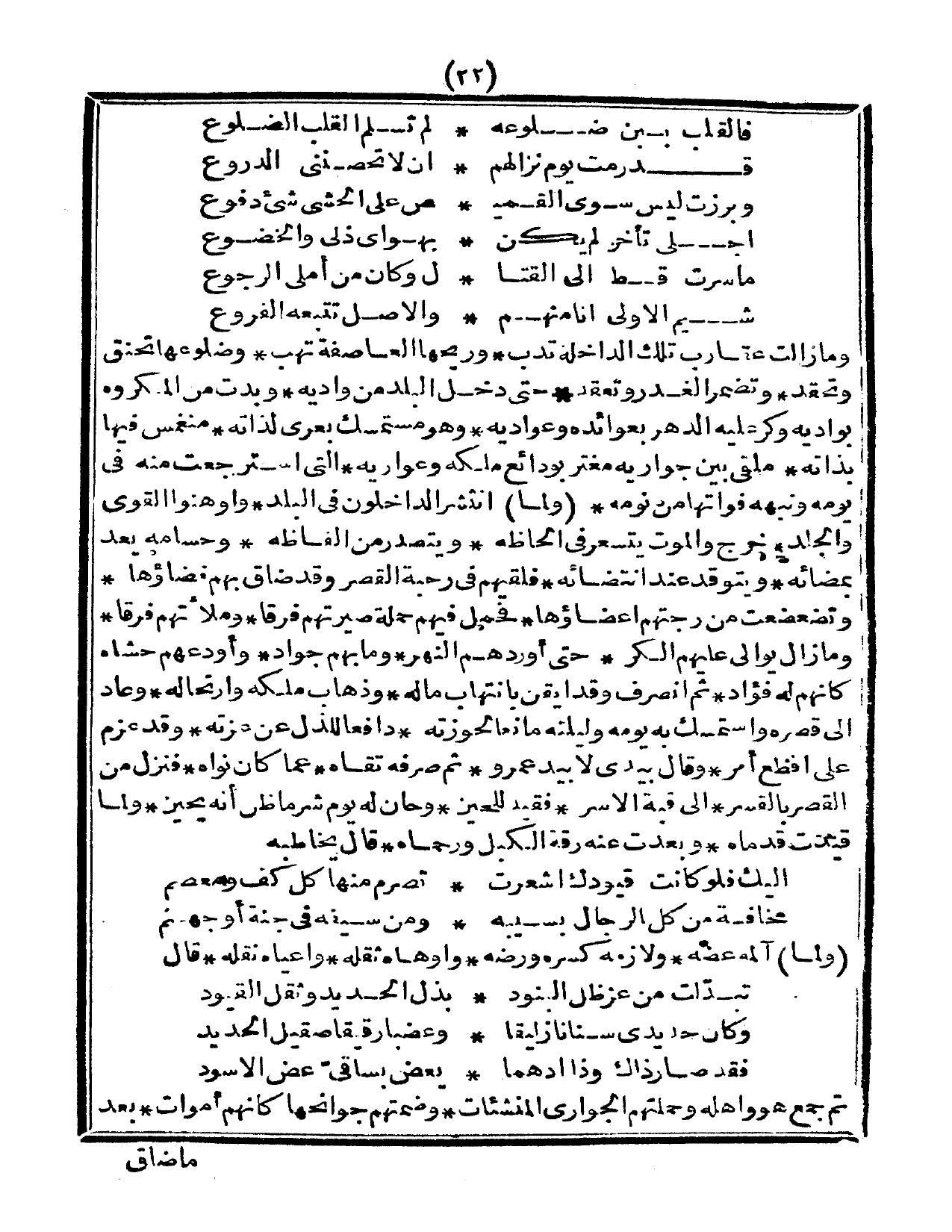 وما زالت عقارب تلك الداخلة تدب، وريحها العاصفة تهب، وضلوعها تحنق وتحقد، وتضمر الغدر وتعتقد، حتى دخل البلد من واديه، وبدت من المكروه بواديه، وكر عليه الدهر بعوائد وعواديه، وهو مستمسك بعرى لذاته، منغمس فيها بذاته، ملقى بين جواريه، مغتر بودائع ملكه وعواريه، التي استرجعت منه في يومه، ونبهه فواتها من نومه، ولما انتشر الداخلون في البلد، وأوهنوا القوى والجلد، خرج والموت يتسعر في الحاظه، ويتصدر من ألفاظه، وحسامه يعد بمضائه، ويتوقد عند انتضائه، فلقيهم في رحبة القصر وقد ضاق بهم فضاؤها، وتضعضعت من رجتهم أعضاؤها، فحمل فيهم حملة صيرتهم فرقاً، وملأتهم فرقاً، ومازال يوالي عليهم الكر، حتى أوردهم النهر، وما بهم جواد، وأودعهم حشاه كأنهم له فؤاد، ثم انصرف وقد أيقن بانتهاب ماله، وذهاب ملكه وارتحاله، وعاد إلى قصره واستمسك به يومه وليته مانعاً لحوزته، دافعاً للذل عن عزته، وقد عزم على أفظع أمر، وقال يبدي لا بيد عمرو، ثم صرفه تقاه، عما كان نواه، فنزل من القصر بالقسر، إلى قبة الأسر، فقيد للحين، وحان له يوم شر ما ظن أنه يحين، ولما قيدت قدماه، وبعدت عنه رقة الكبل ورحماه، قال يخاطبه: طويل
