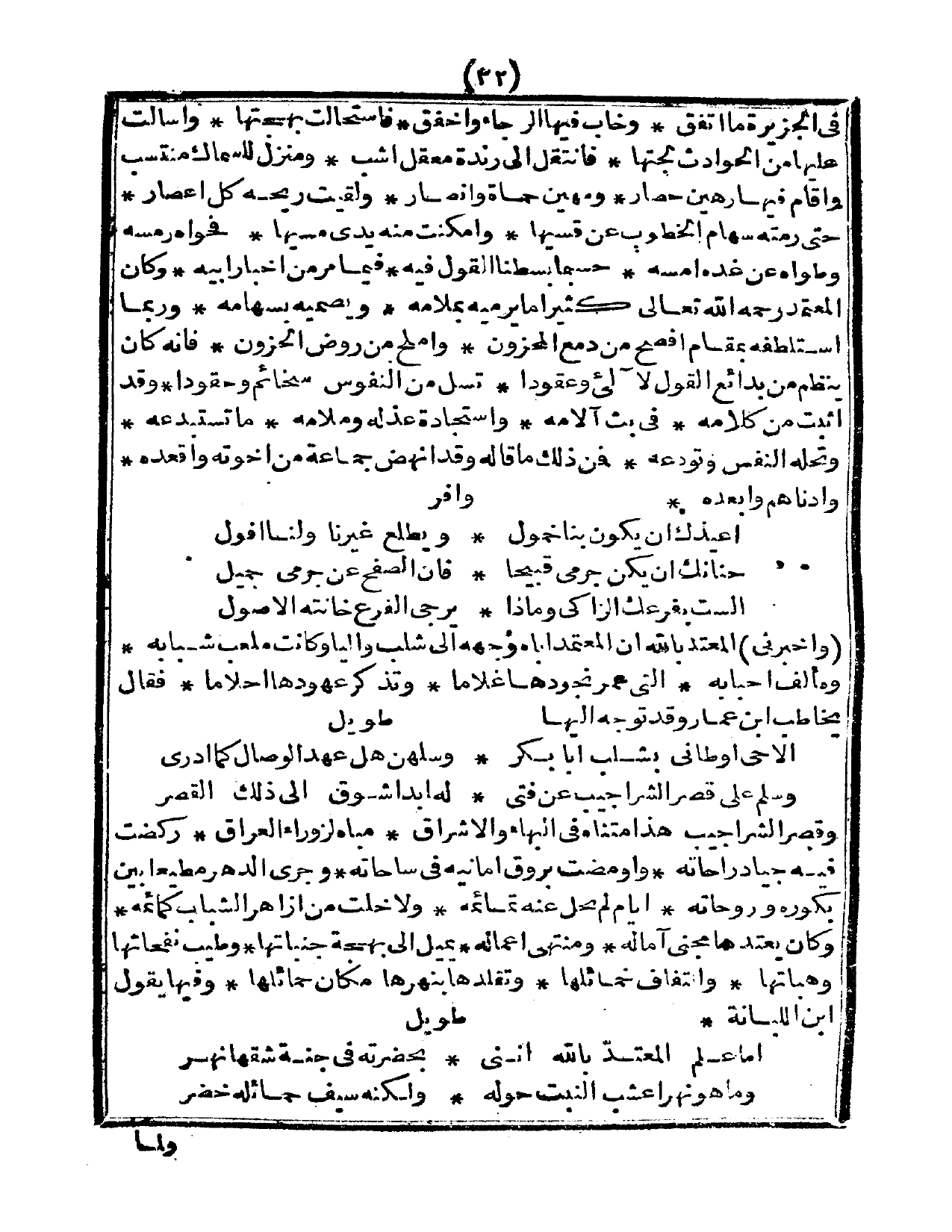 في الجزيرة ما تفق، وخاب فيها الرجاء وأخفق، فاستحالت بهجتها، وأسالت عليها من الحوادث لجتها، فانتقل إلى رندة معقل أشب، ومنزل للسماك متنسب، وأقام فيها رهن حصار، ومهين حماة وأنصار، ولقيت ريحه كل أعصار، حتى رمته سهام الخطوب عن قسيها، وأمكنت منه يدي مسيها، فحواه رمسه، وطواه عن غده أمسه، حسبما بسطنا القول فيه، فيما مر من أخبار أبيه، وكان المعتمد رحمه الله تعالى كثيراً ما يرميه بملامه، ويصميه بسهامه، وربما استلطفه بمقال أفصح من دمع المحزون، وأملح من روض الحزون، فإنه كان ينظم من بدائع القول لئلئ وعقوداً، تسل من النفوس سخائم وحقوداً، وقد أثبت من كلامه، في بث الأمة، واستجادة عذله وملامه، ما تستبدعه، وتحله النفس وتودعه، فمن ذلك ما قاله وقد أنهض جماعة من أخوته وأقعده، وأدناهم وأبعده: وافر